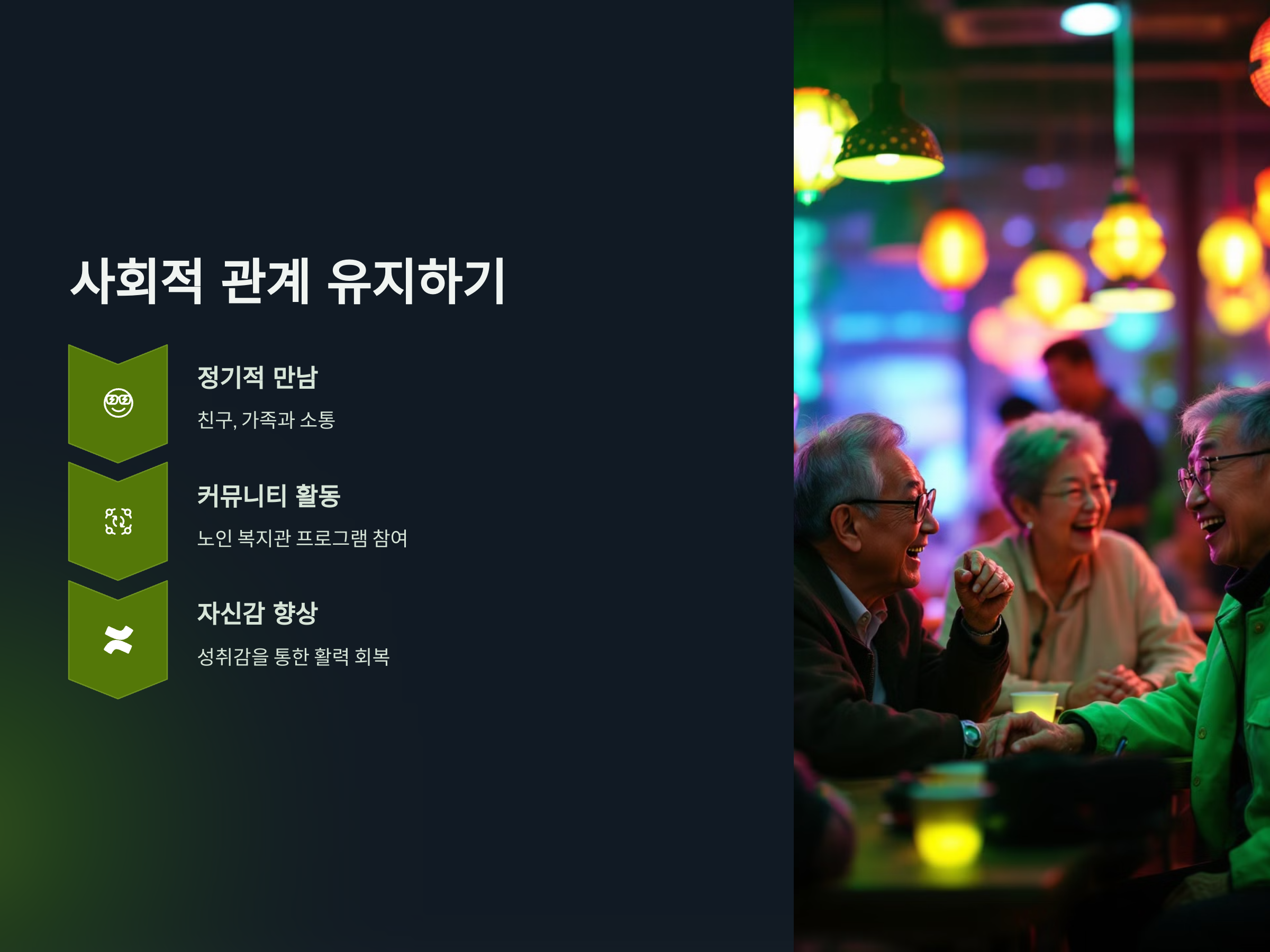 사회적 관계는 노인의 정신 건강에 중요한 요소 중 하나입니다. 고립된 생활은 우울증의 위험을 높이는데, 이는 정서적인 지원과 신체 활동의 부족으로 이어지기 때문입니다. 친구나 가족과의 정기적인 만남, 전화 통화 또는 커뮤니티 활동에 참여하는 것만으로도 정신적으로 큰 도움이 됩니다.