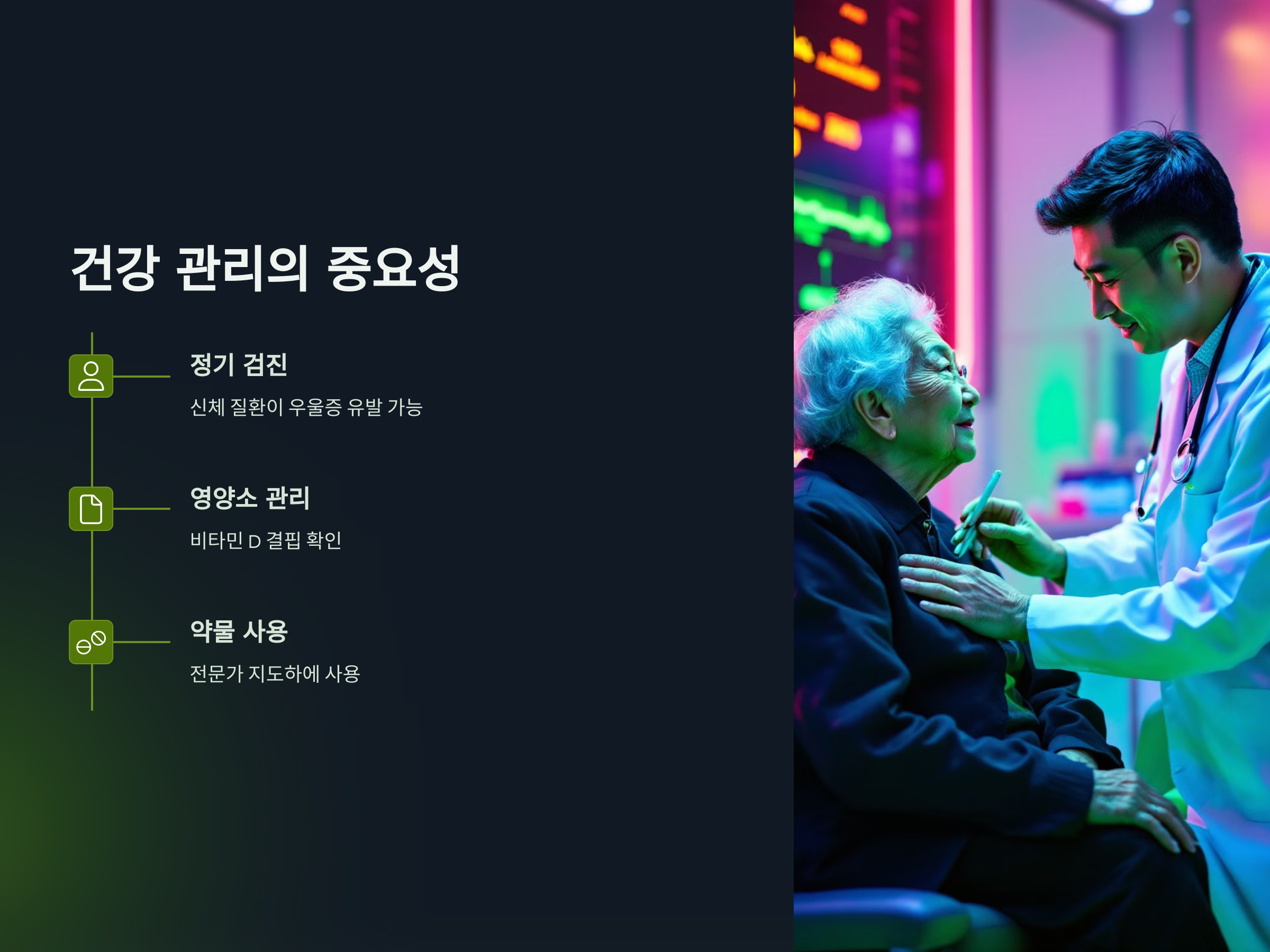 우울증 예방을 위한 또 다른 방법은 정기적인 건강 검진입니다. 노인의 경우 다양한 신체적 질환이 우울증을 유발할 수 있기 때문에, 건강 상태를 점검하는 것이 중요합니다. 특히, 갑상선 기능 저하나 비타민 D 결핍과 같은 문제들은 우울증과 유사한 증상을 보일 수 있으므로, 이를 예방하기 위해 정기적인 검사와 상담을 받는 것이 필요합니다.