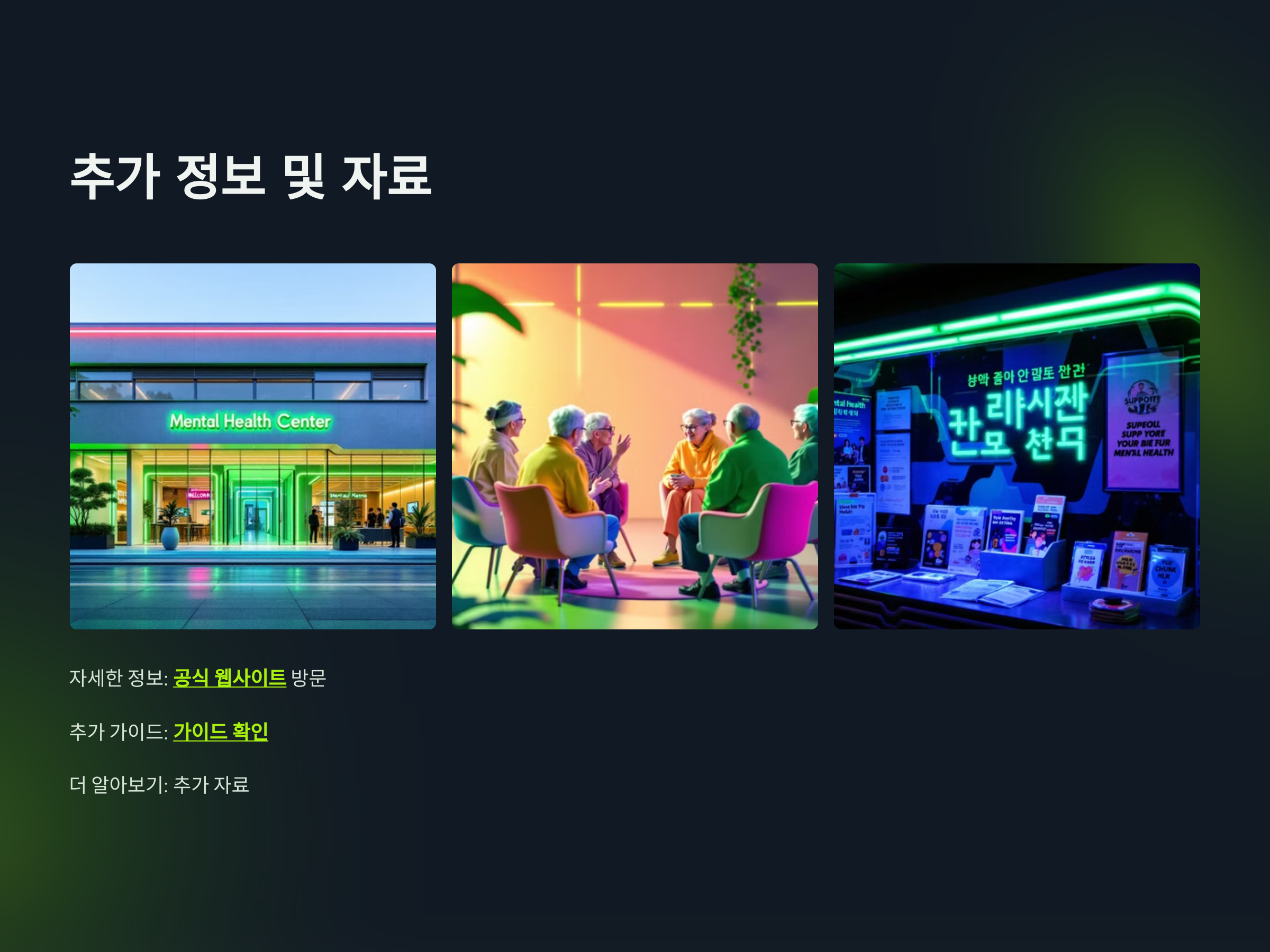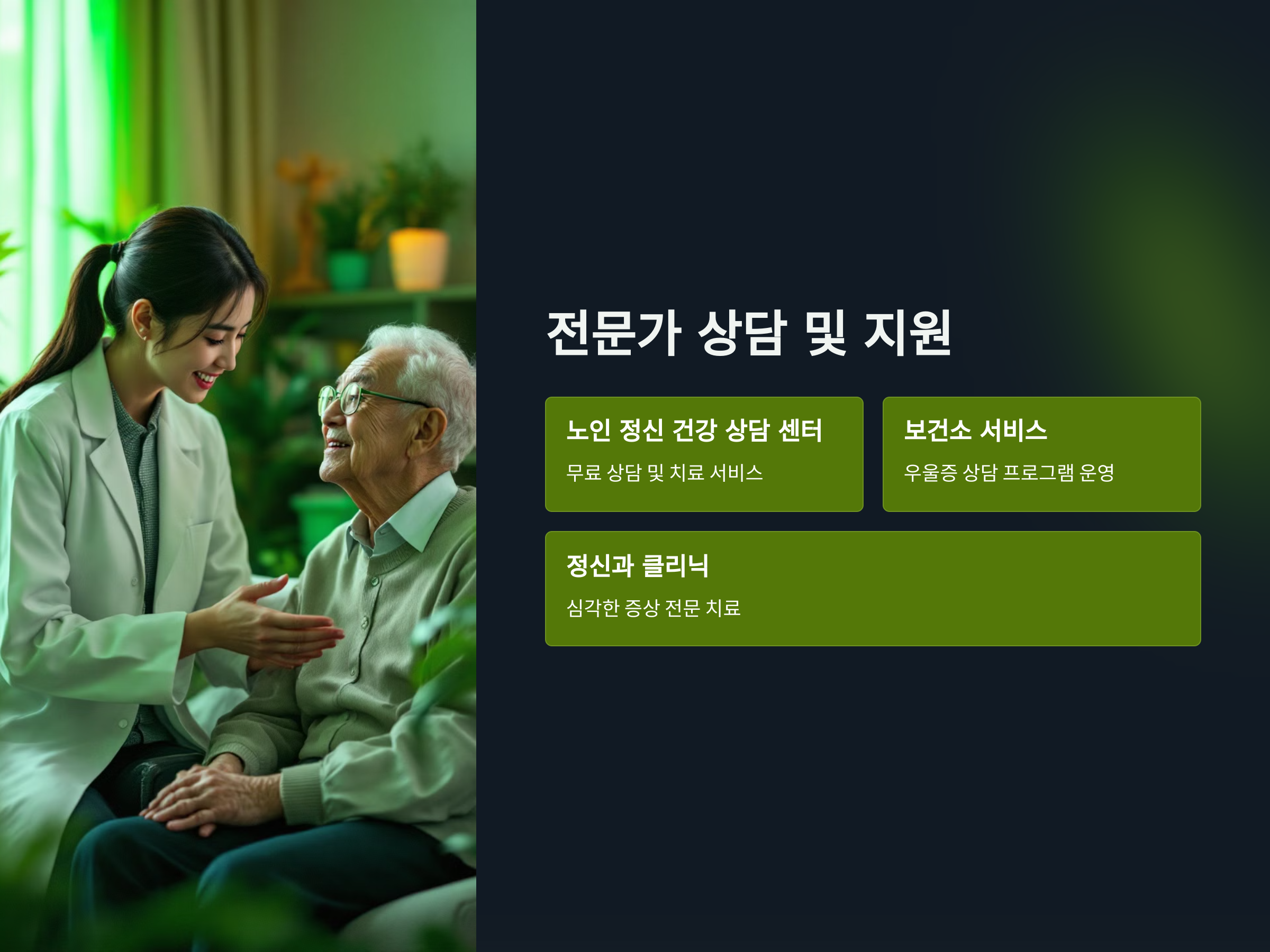 많은 시군구에서 운영하는 노인 정신 건강 상담 센터에서는 무료 상담과 치료 서비스를 제공합니다. 또한, 정신 건강 전문가들이 상담을 통해 우울증의 초기 징후를 발견하고, 맞춤형 치료를 제시합니다.