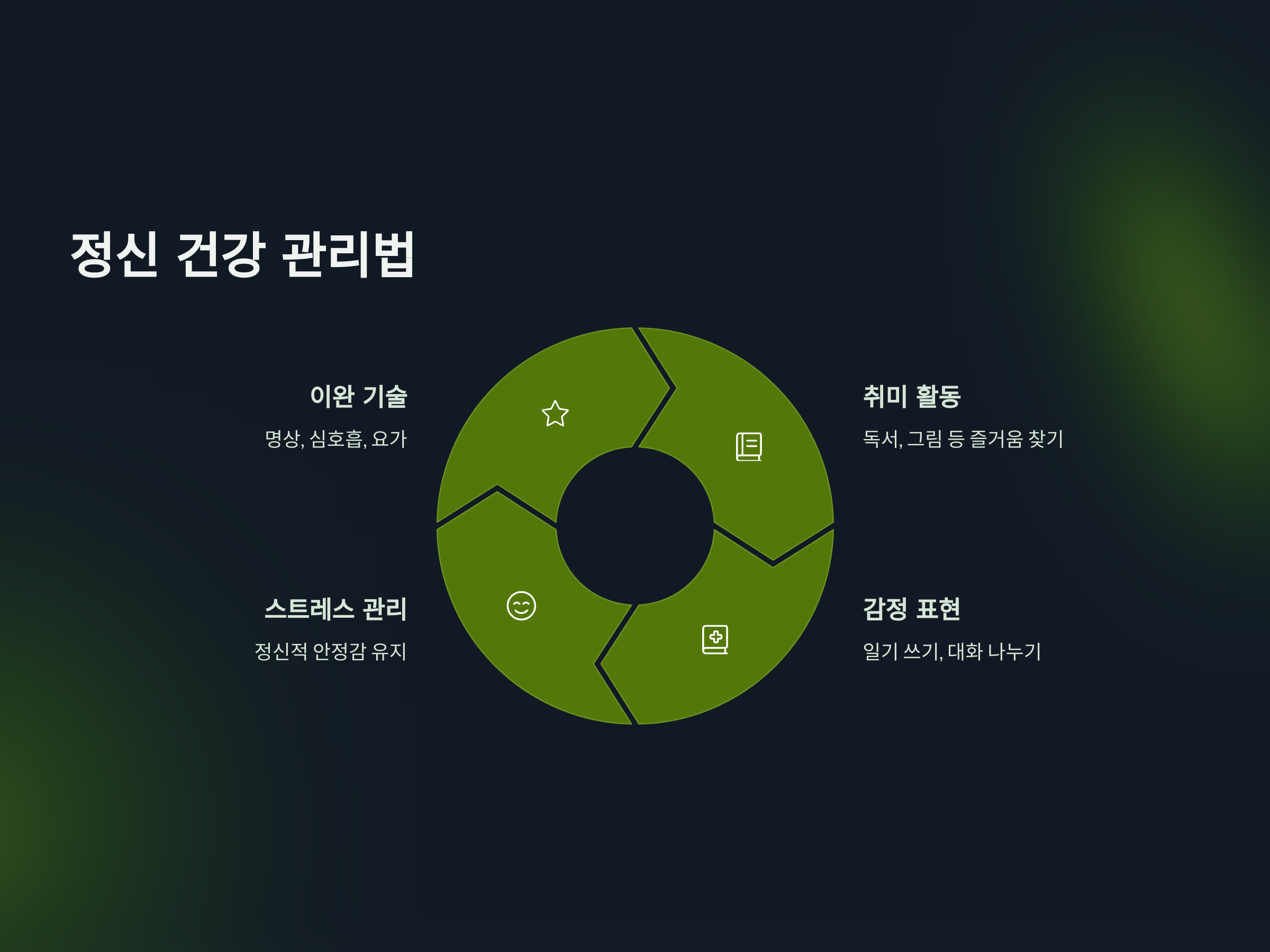 정신 건강을 유지하는 것도 매우 중요합니다. 정신적인 스트레스나 걱정은 우울증을 유발할 수 있기 때문에, 마음의 건강을 지키기 위한 방법을 실천하는 것이 좋습니다. 예를 들어, 명상, 심호흡, 요가 등의 이완 기술을 배우고 실천하면 스트레스를 줄일 수 있습니다. 또한, 책을 읽거나 좋아하는 취미 활동을 통해 일상에서의 즐거움을 찾는 것이 중요합니다.