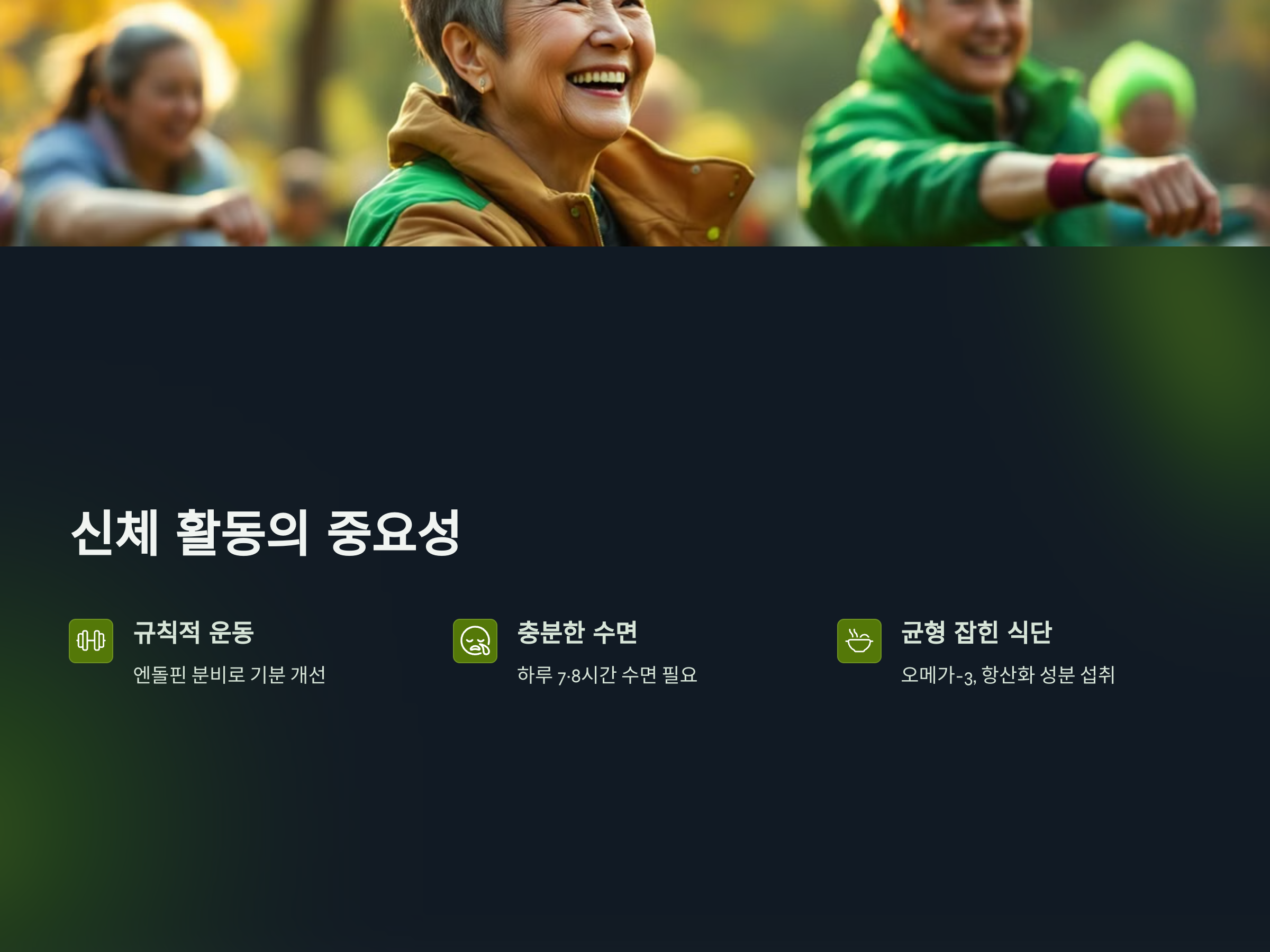 노인 우울증 예방을 위한 생활 습관은 신체적, 정신적, 사회적 활동을 균형 있게 유지하는 것입니다. 규칙적인 신체 활동은 우울증 예방에 중요한 역할을 합니다. 연구에 따르면 운동은 뇌에서 엔돌핀을 분비하게 하여 기분을 좋게 만드는 효과가 있습니다. 또한, 꾸준한 운동은 심혈관 건강과 근육을 강화하여 몸의 기능을 향상시켜주므로 전반적인 건강 유지에 도움이 됩니다.