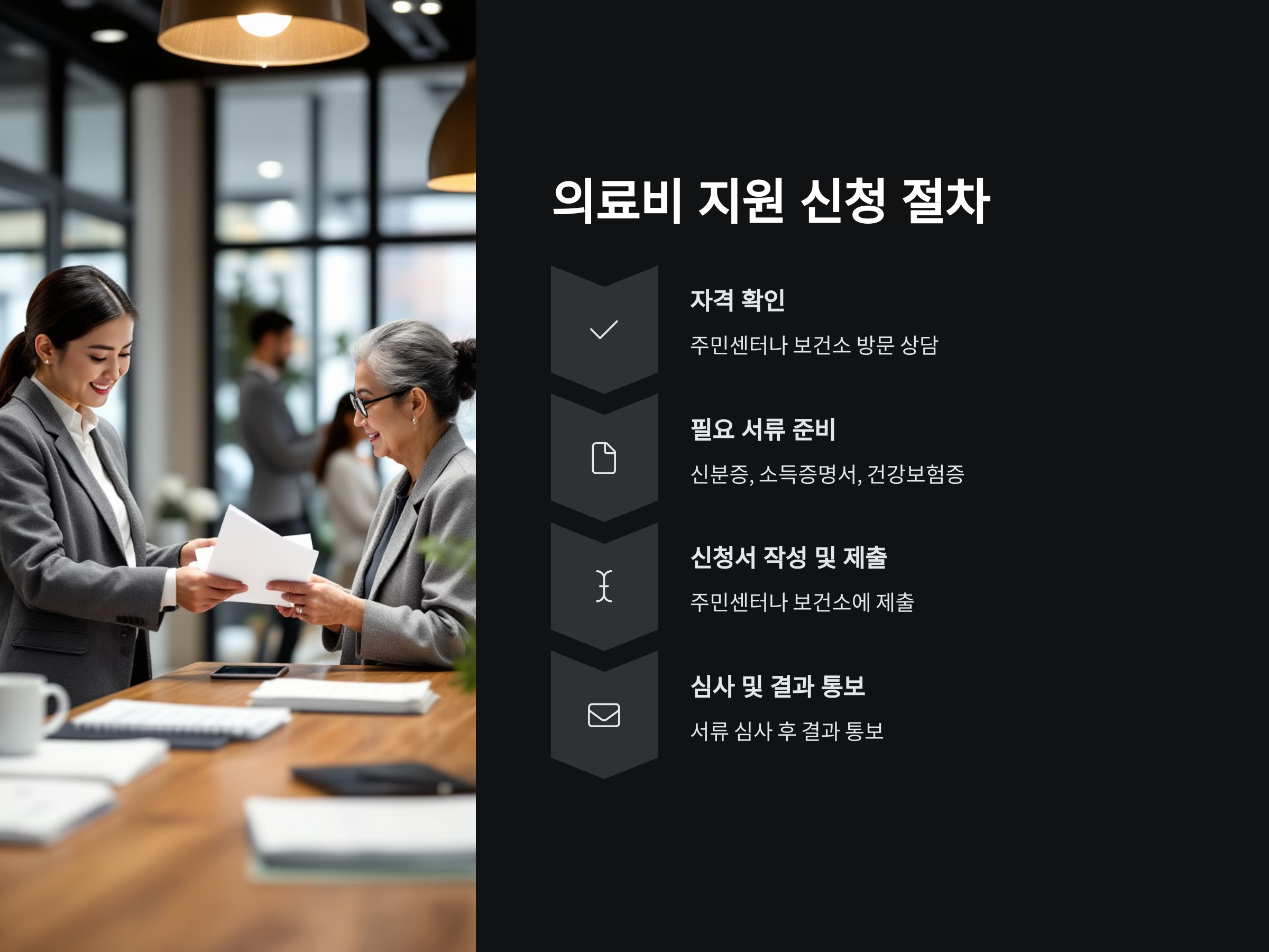 의료비 지원을 받기 위해서는 다음과 같은 절차를 따라야 합니다: