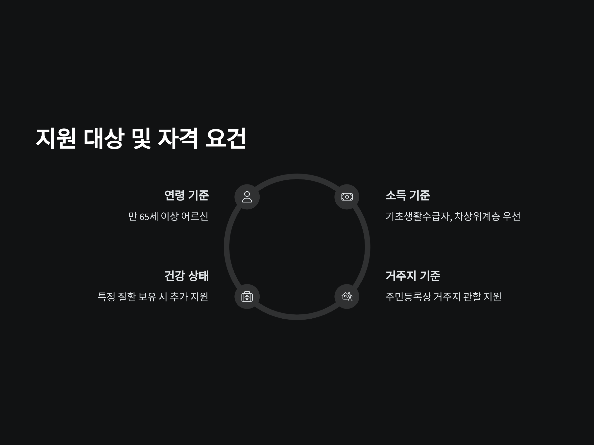 지원 대상은 일반적으로 만 65세 이상의 어르신들이며, 소득 수준에 따라 지원 범위가 달라질 수 있습니다. 기초생활수급자, 차상위계층, 저소득층 어르신들이 주요 대상이지만, 구체적인 자격 요건은 거주지 관할 주민센터나 보건소를 통해 확인하시는 것이 좋습니다. citeturn0search3