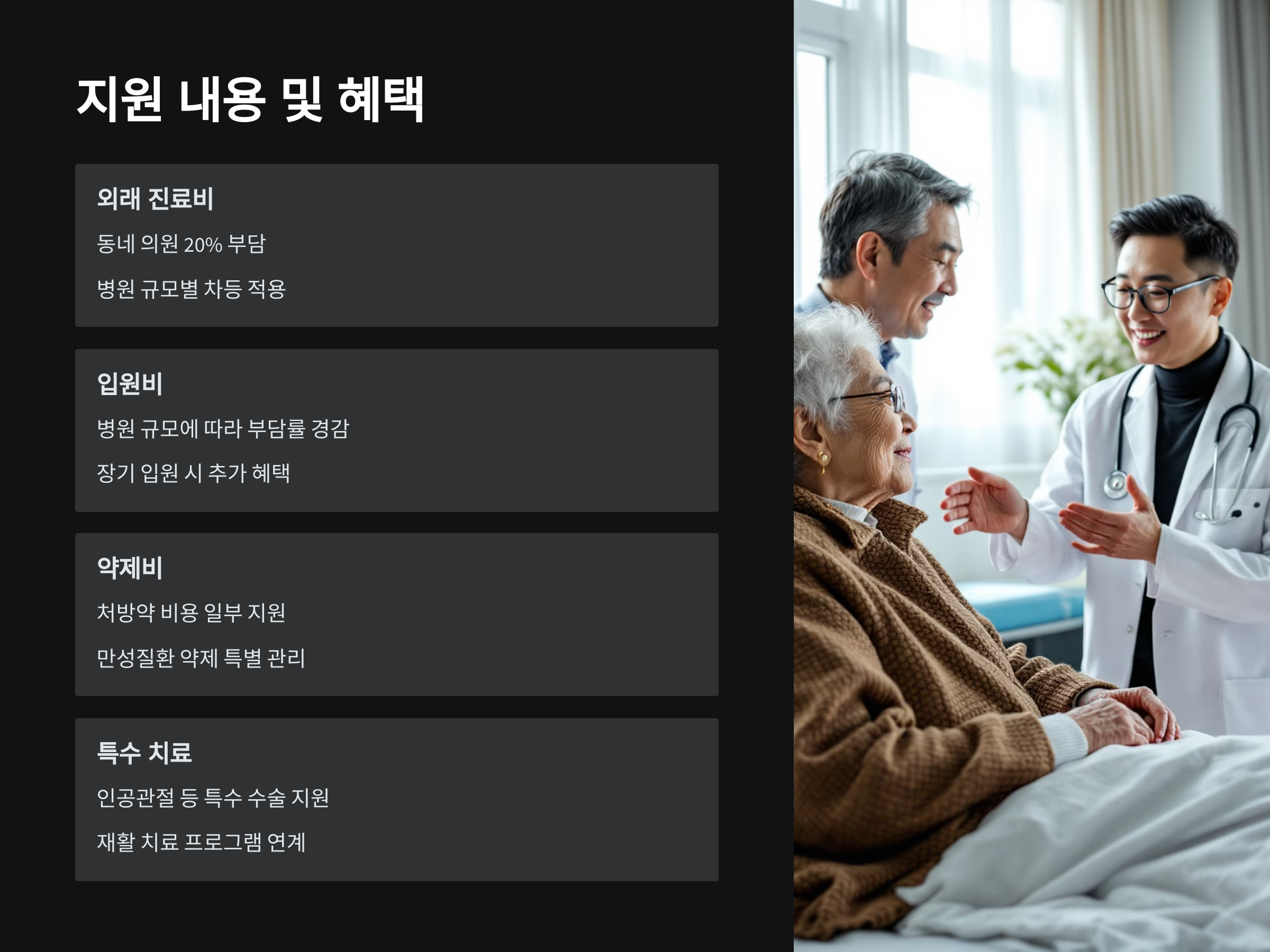 지원 내용은 다양하며, 주로 병원 진료비, 약제비, 입원비 등이 포함됩니다. 예를 들어, 동네 의원에서의 외래 진료 시 본인 부담률이 20%로 경감되며, 입원 시에도 병원 규모에 따라 본인 부담률이 낮아집니다. citeturn0search1
