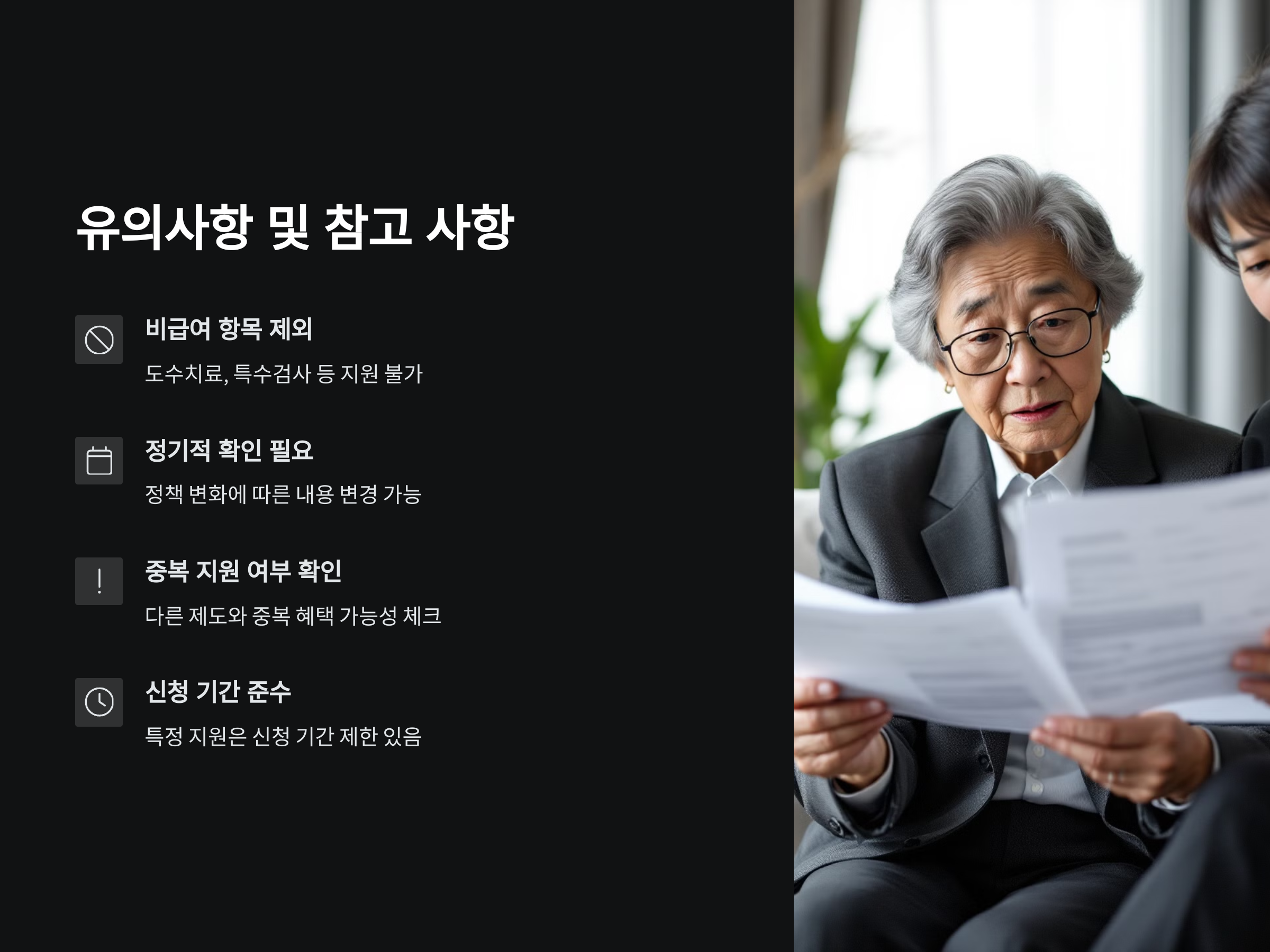 - 비급여 항목 제외: 비급여 항목(예: 도수치료, 특수검사 등)은 지원 대상에서 제외됩니다.