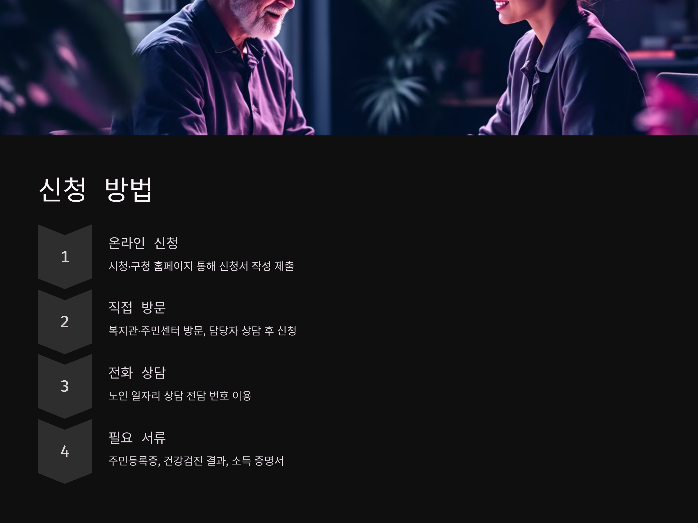 노인 일자리 사업은 각 지역의 사회복지시설 및 복지센터를 통해 신청할 수 있으며, 자세한 신청 방법은 다음과 같습니다.