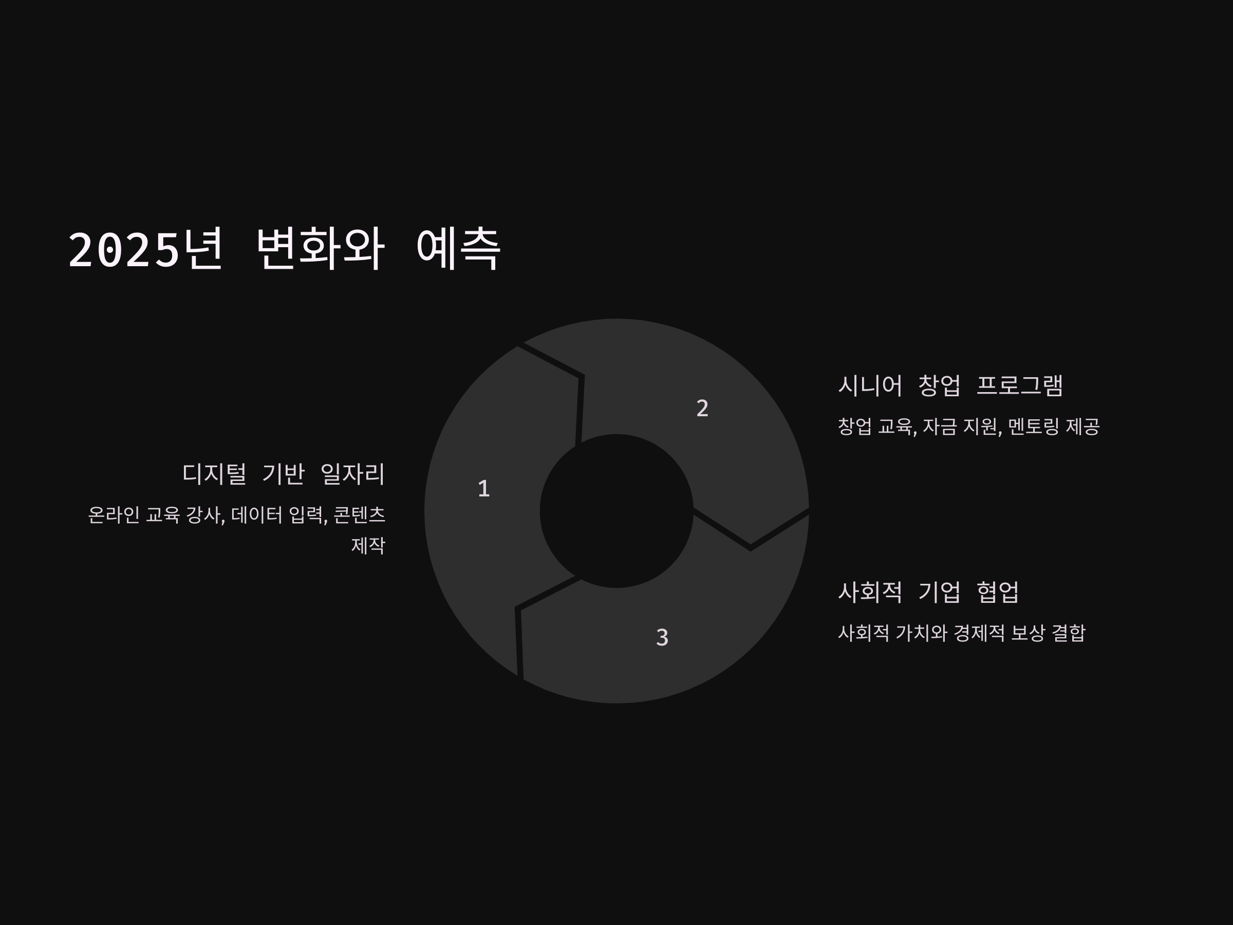 또한, 노인들이 직접 창업을 할 수 있도록 지원하는 프로그램이 확대될 것입니다. 정부는 시니어 창업을 촉진하기 위해 창업 교육, 자금 지원, 멘토링 등을 제공하고 있으며, 이를 통해 노인들이 스스로 경제 활동을 할 수 있는 환경을 조성할 계획입니다.