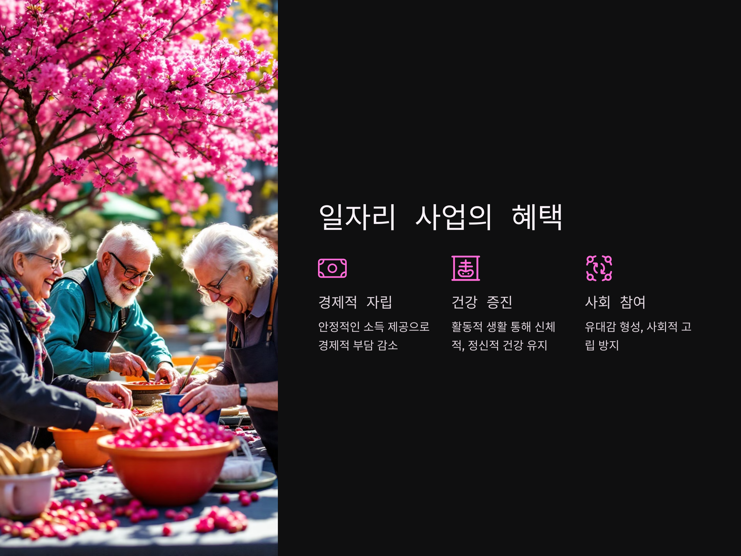 노인들이 건강하고 활기찬 삶을 유지할 수 있도록, 정부와 사회가 제공하는 다양한 일자리 기회를 적극 활용하는 것이 중요합니다. 노인 일자리 사업은 노인들에게 소득을