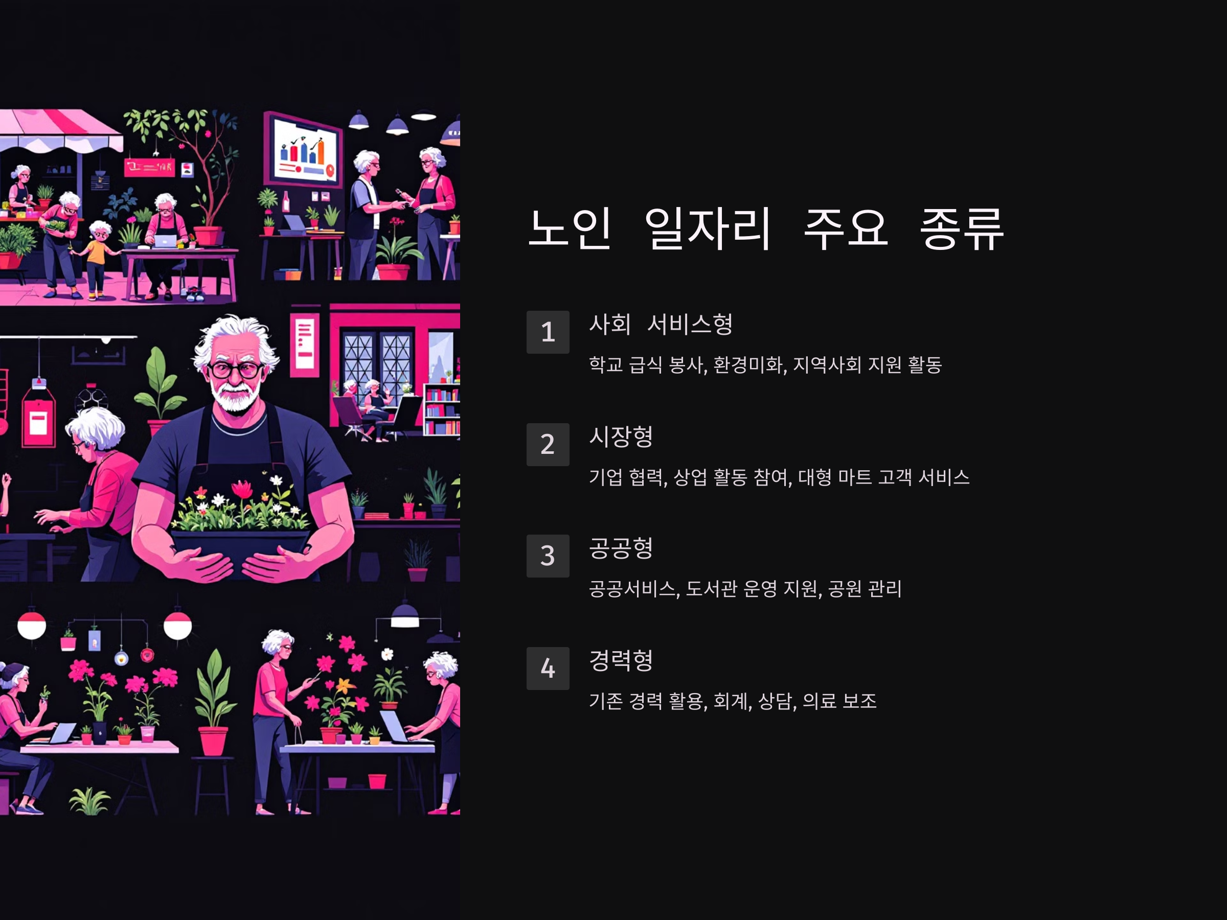 노인 일자리 사업에는 여러 가지 형태가 있으며, 각 사업은 노인의 능력과 관심사에 맞게 설계됩니다. 가장 일반적인 종류는 다음과 같습니다.