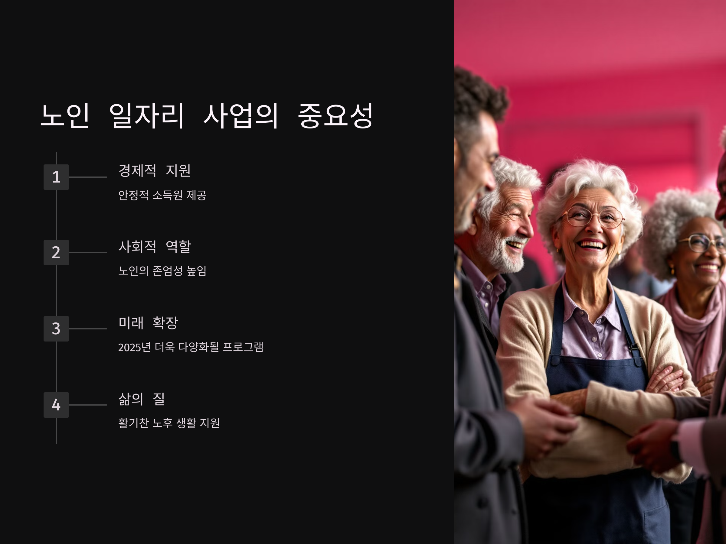 2025년을 맞이하여 노인 일자리 사업은 더욱 다양해지고 있습니다. 고령화 사회에서 노인의 경제적 자립을 지원하는 일자리 사업은 단순한 일자리를 넘어, 노인의 삶의 질을 향상시키고, 사회적 고립을 예방하는 중요한 역할을 합니다.