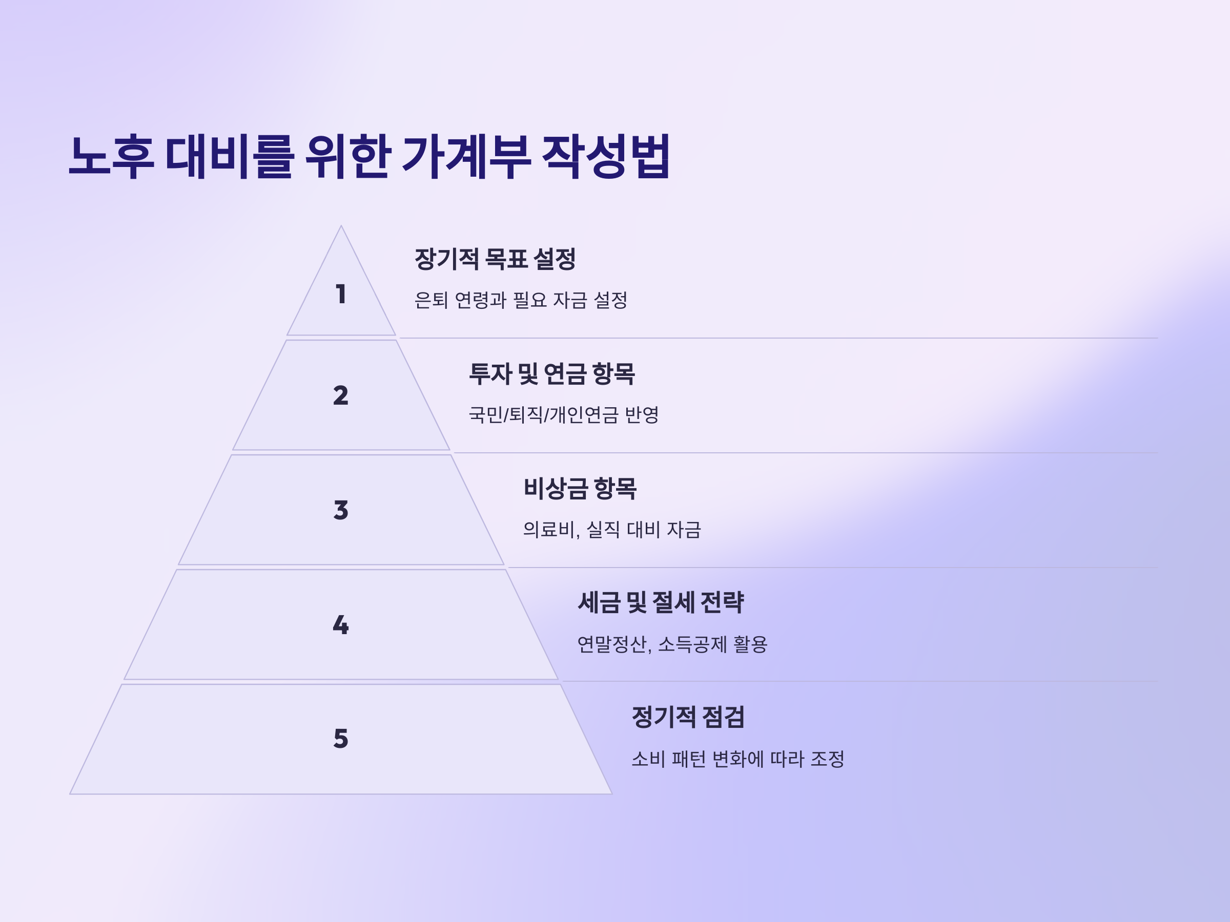 노후 대비를 위해서는 단순히 현재의 소비를 기록하는 것뿐만 아니라, 미래의 재정 계획까지 고려해야 합니다. 다음과 같은 방식으로 가계부를 작성하면 효과적으로 노후를 준비할 수 있습니다.