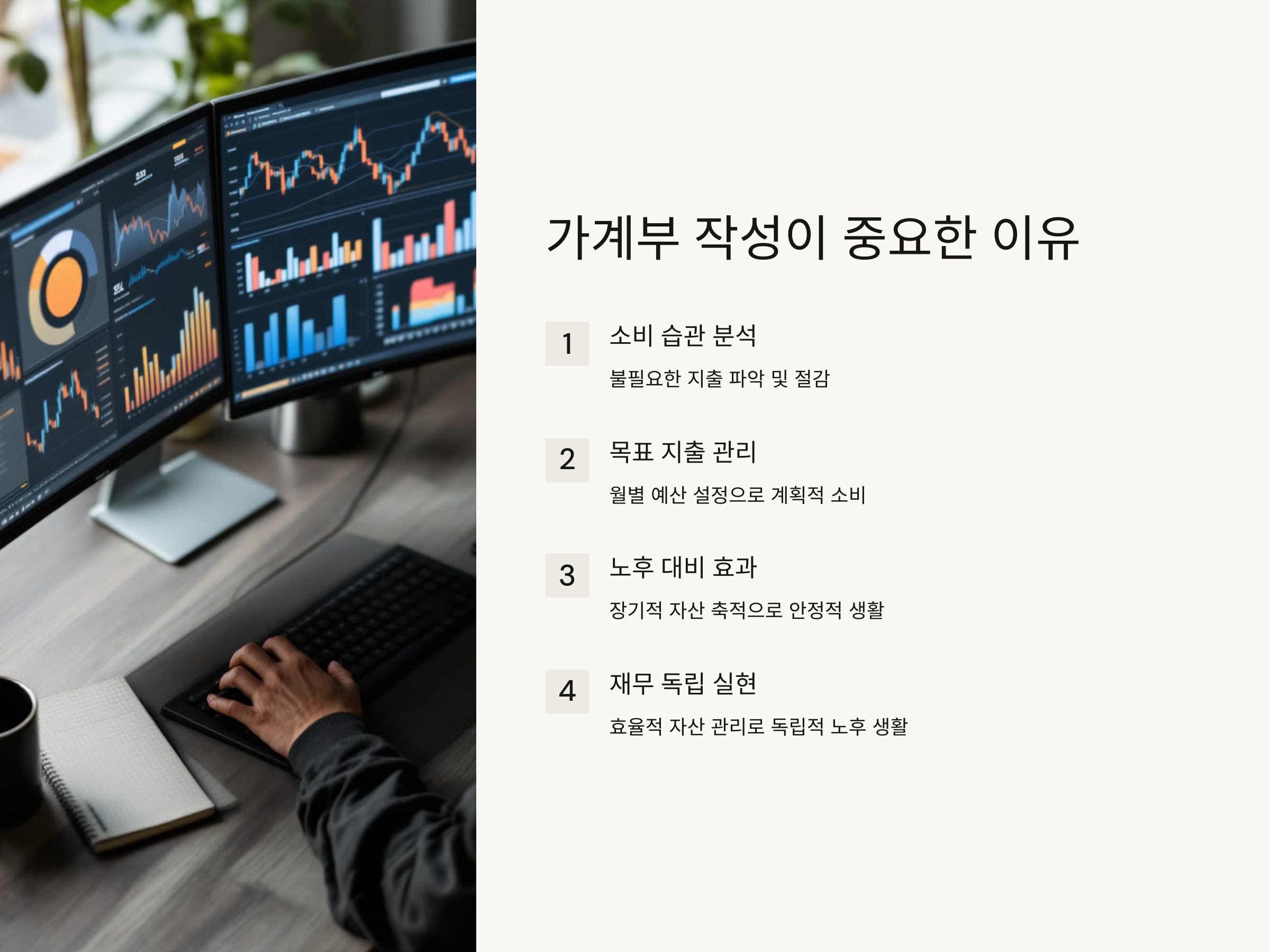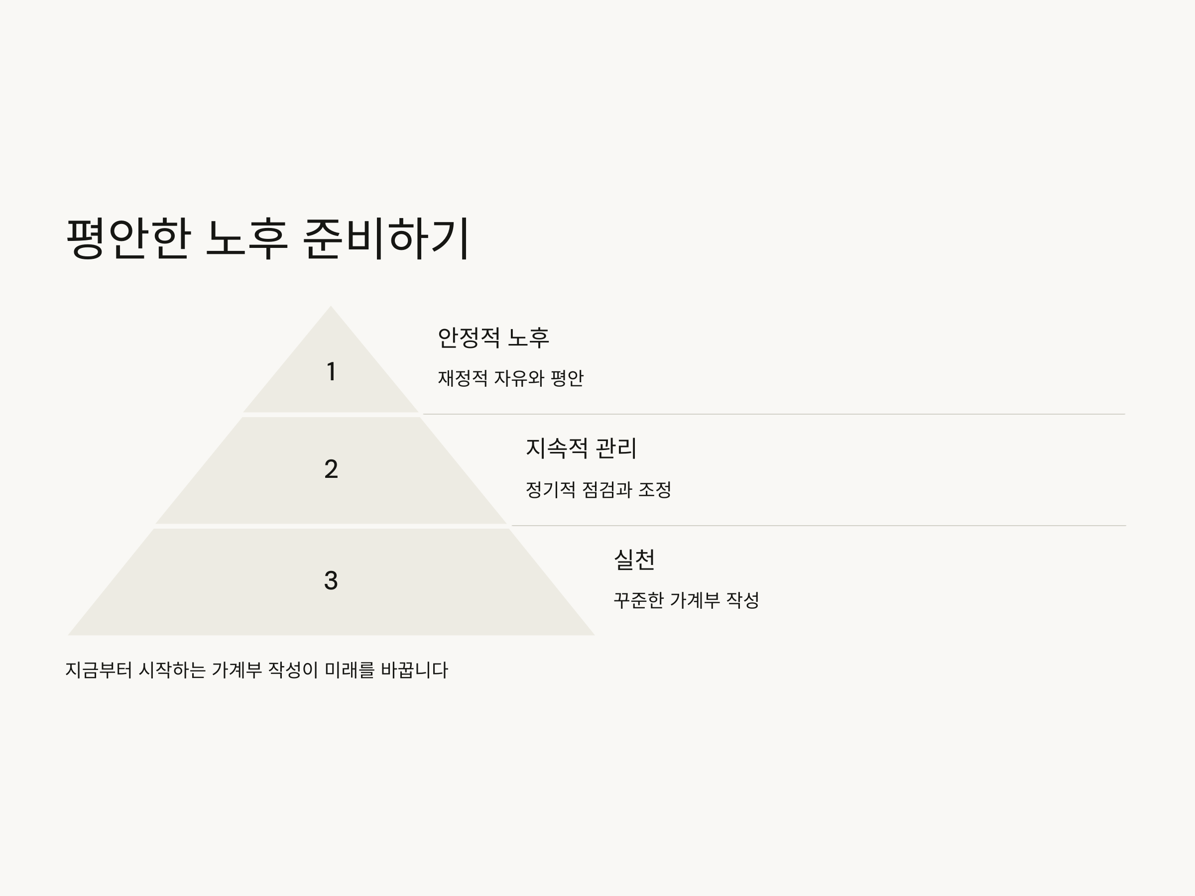 가계부를 작성하면 자신의 재정 상황을 한눈에 파악할 수 있으며, 불필요한 지출을 줄이고 저축 목표를 설정하는 데 큰 도움이 됩니다. 특히 노후를 대비하기 위해서는 현재의 소비 패턴을 분석하고 장기적인 재정 계획을 세우는 것이 중요합니다.