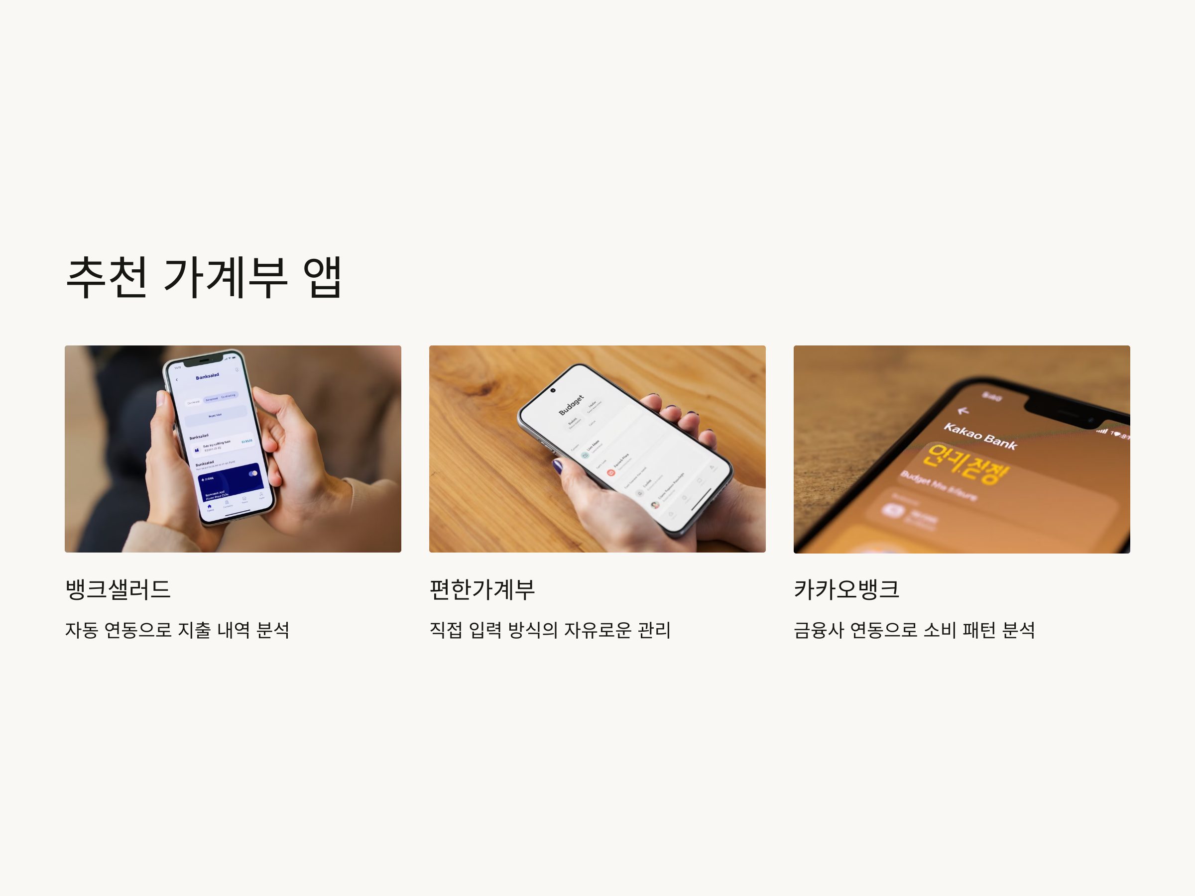 - 편한가계부: 사용자가 직접 입력하는 방식으로 자유롭게 관리 가능.