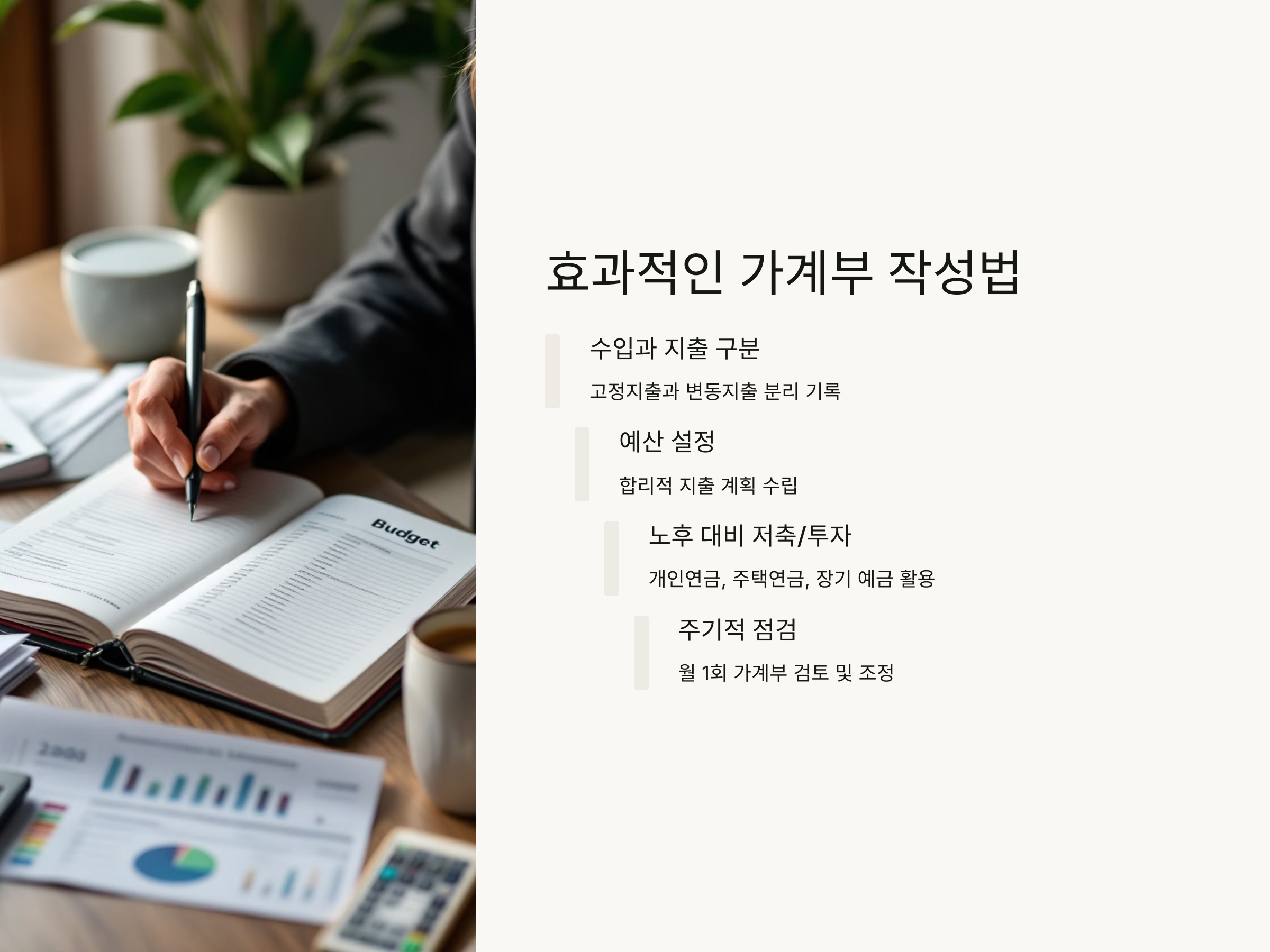수입과 지출을 명확히 나누고, 고정지출과 변동지출을 따로 기록하는 것이 중요합니다. 특히 연금, 투자 수익, 부수입 등을 따로 정리하면 노후 자산을 효과적으로 관리할 수 있습니다.