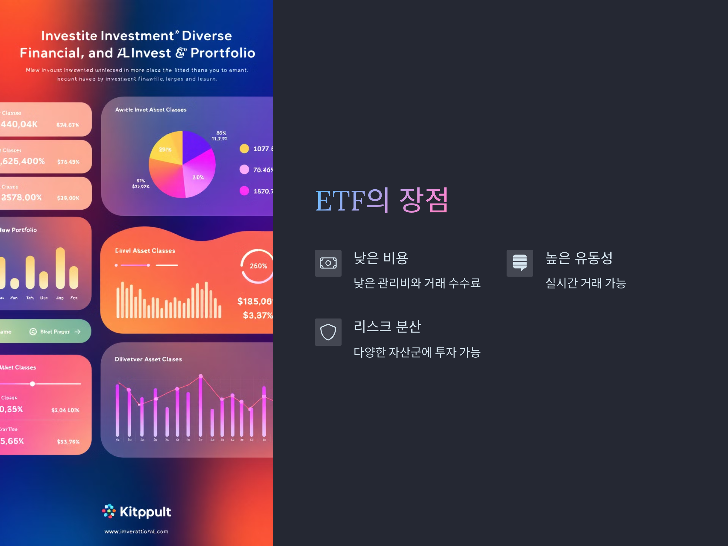 ETF는 다양한 자산군에 투자할 수 있어, 투자자가 리스크를 분산시킬 수 있는 기회를 제공합니다. 예를 들어, 주식뿐만 아니라 채권, 금, 원자재, 해외시장 등 다양한 분야에 투자하는 ETF가 존재합니다. 이를 통해 투자자는 한 가지 자산에 집중하기보다는 다양한 자산군에 투자하여 위험을 줄이고 안정적인 수익을 추구할 수 있습니다.
