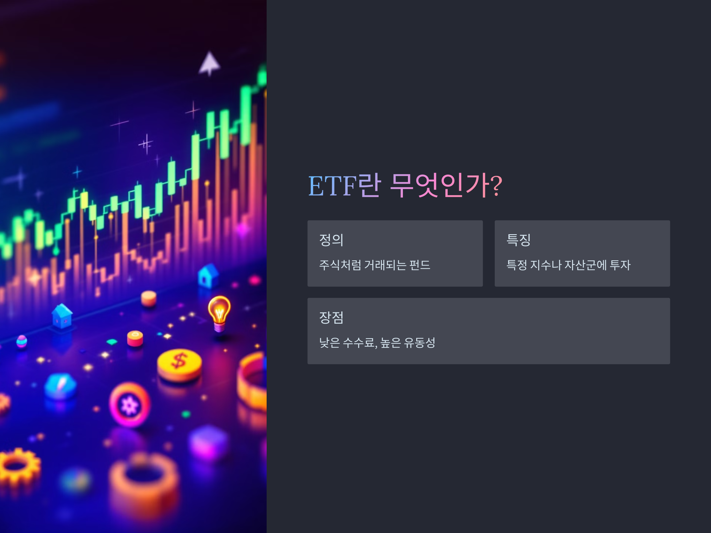 ETF(상장지수펀드)는 주식처럼 증권거래소에서 거래되는 펀드입니다. ETF는 특정 지수나 자산군에 투자하는 펀드로, 보통 주식, 채권, 원자재 등 다양한 자산에 분산 투자할 수 있도록 설계되어 있습니다. 일반적으로 ETF는 낮은 수수료와 높은 유동성을 자랑하며, 거래가 용이하고 분산 투자 효과를 누릴 수 있다는 장점이 있습니다.