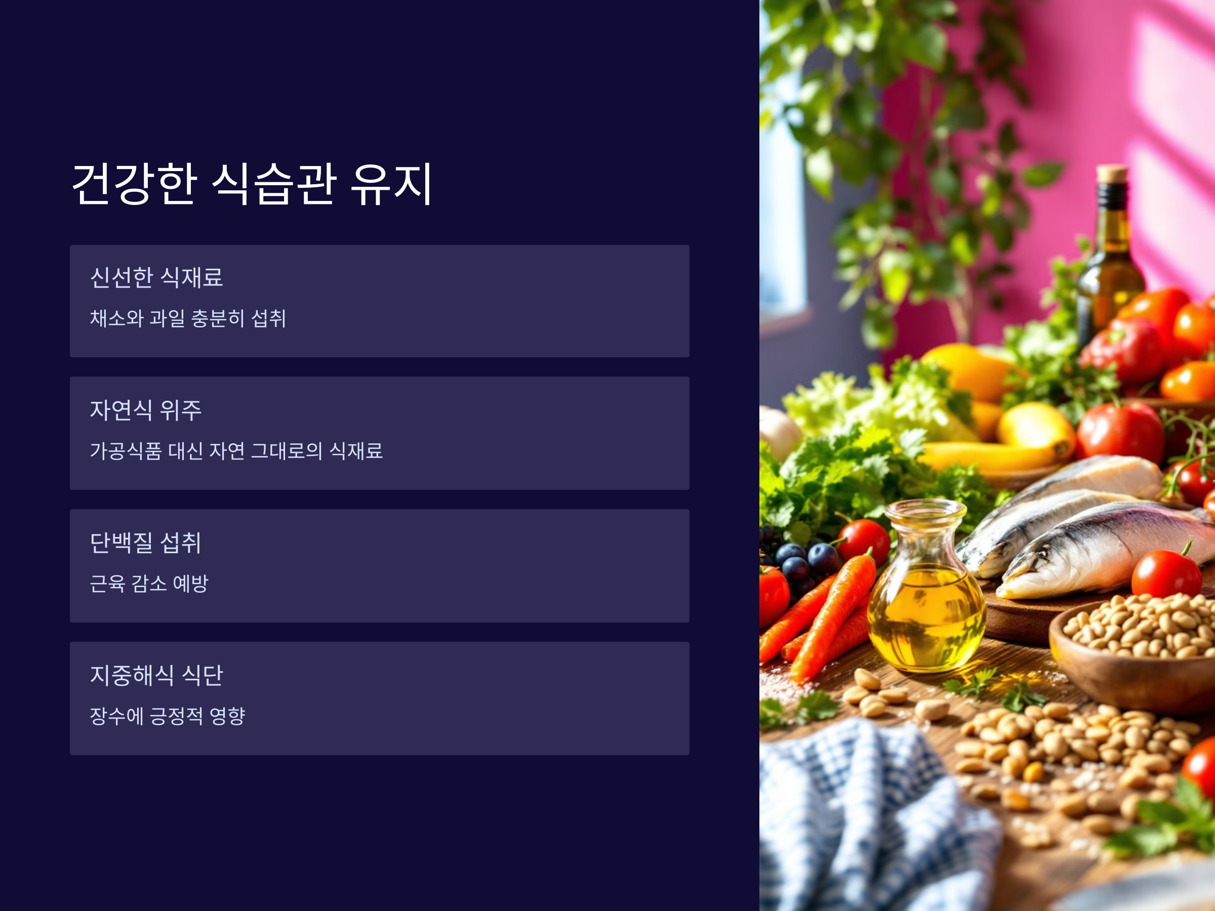 음식은 건강의 기본이다. 노후에도 건강하게 살기 위해서는 영양 균형을 맞춘 식습관이 필수적이다. 장수하는 사람들은 식단에서 가공식품을 줄이고 자연식 위주로 식사를 한다. 특히 다음과 같은 식습관이 도움이 된다.