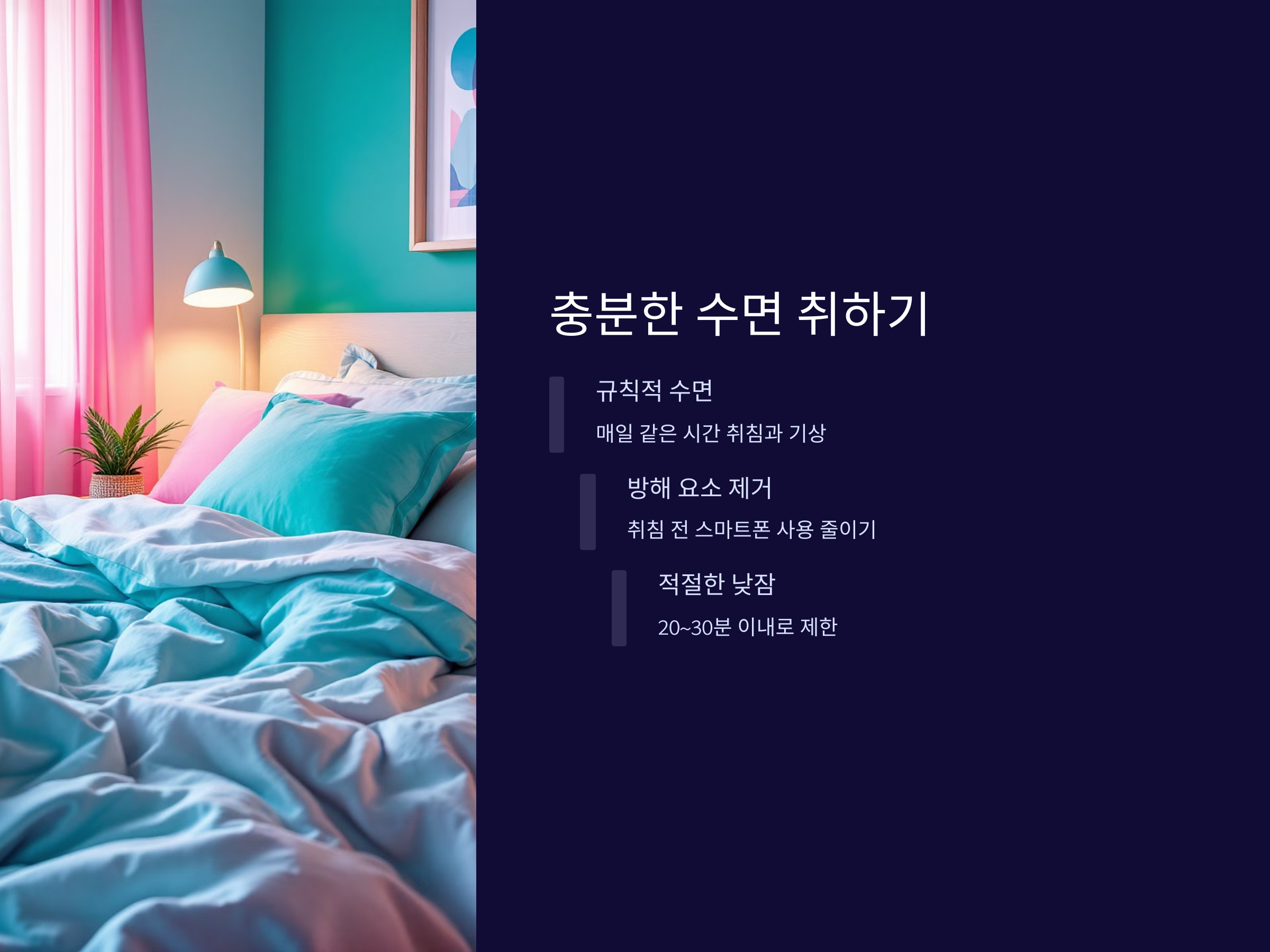- 스마트폰 사용을 줄이고, 숙면을 방해하는 요인을 제거한다.