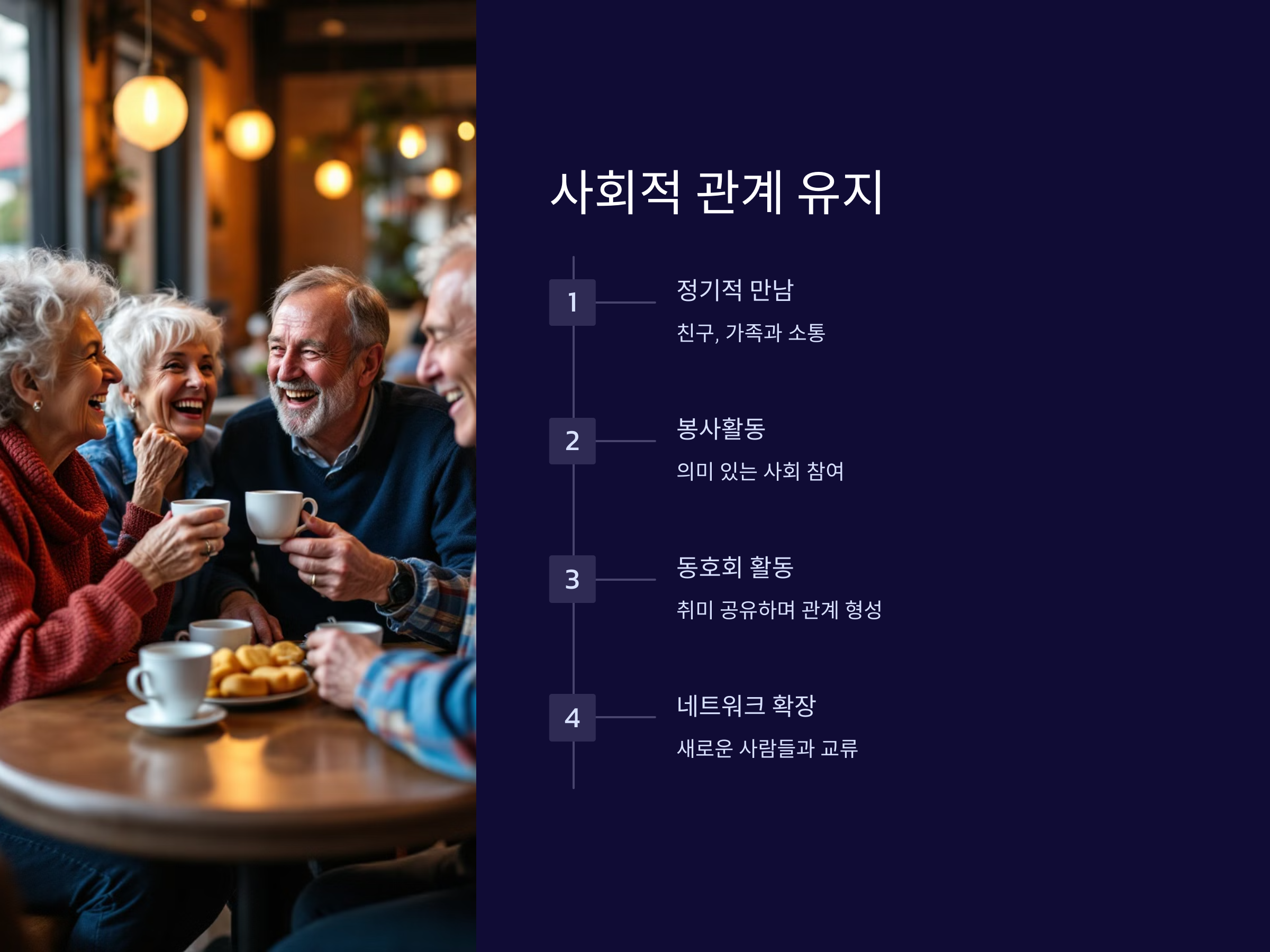 고립된 생활을 하는 노인들은 건강이 빠르게 악화될 가능성이 높다. 반면, 사회 활동을 활발히 하는 사람들은 더 오래 건강하게 산다는 연구 결과가 있다. 친구, 가족과의 관계를 유지하는 것만으로도 스트레스가 줄어들고, 삶의 질이 높아진다.
