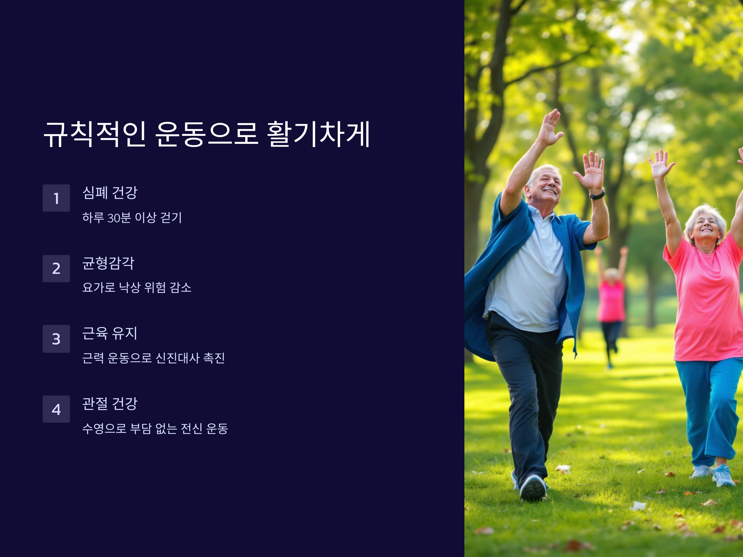 꾸준한 운동은 건강한 노후를 위한 필수 요소다. 연구에 따르면, 규칙적으로 운동하는 사람들은 심장병, 당뇨병, 관절염 등의 만성질환 위험이 줄어든다고 한다. 특히 걷기, 요가, 수영, 가벼운 근력 운동 등이 노년기에 적합한 운동으로 꼽힌다. 중요한 것은 무리하지 않고 지속적으로 운동하는 것이다.