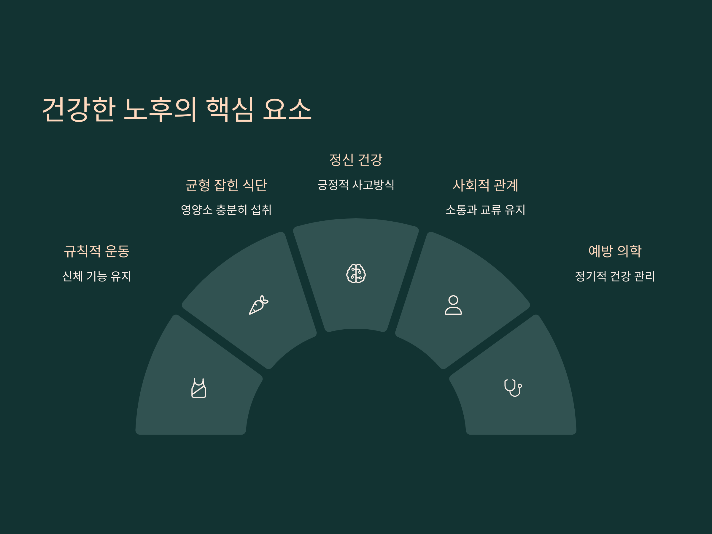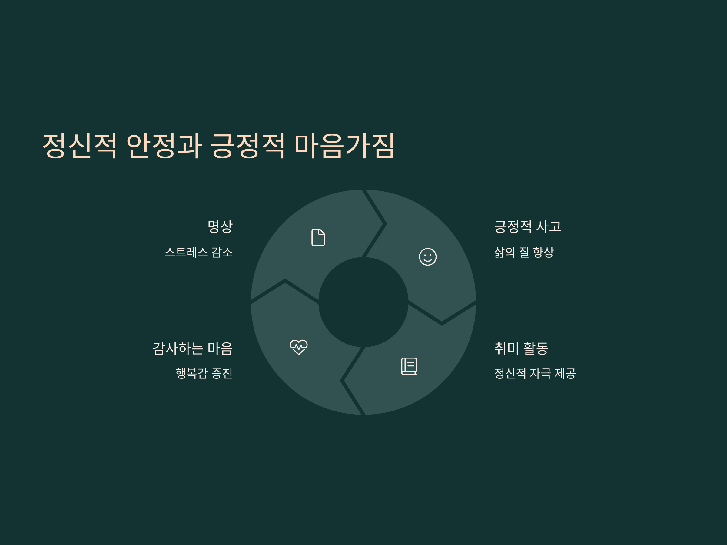 건강한 노후를 보내기 위해서는 정신적인 안정도 매우 중요합니다. 스트레스나 부정적인 감정이 지속되면, 그것이 신체 건강에까지 영향을 미칠 수 있기 때문입니다. 긍정적인 마음가짐과 행복한 삶을 추구하는 사람들은 대체로 스트레스 수준이 낮고, 더 나은 삶의 질을 유지하는 경향이 있습니다. 이를 위해 명상이나 취미 활동 등을 통해 스트레스를 관리하는 것이 좋습니다.