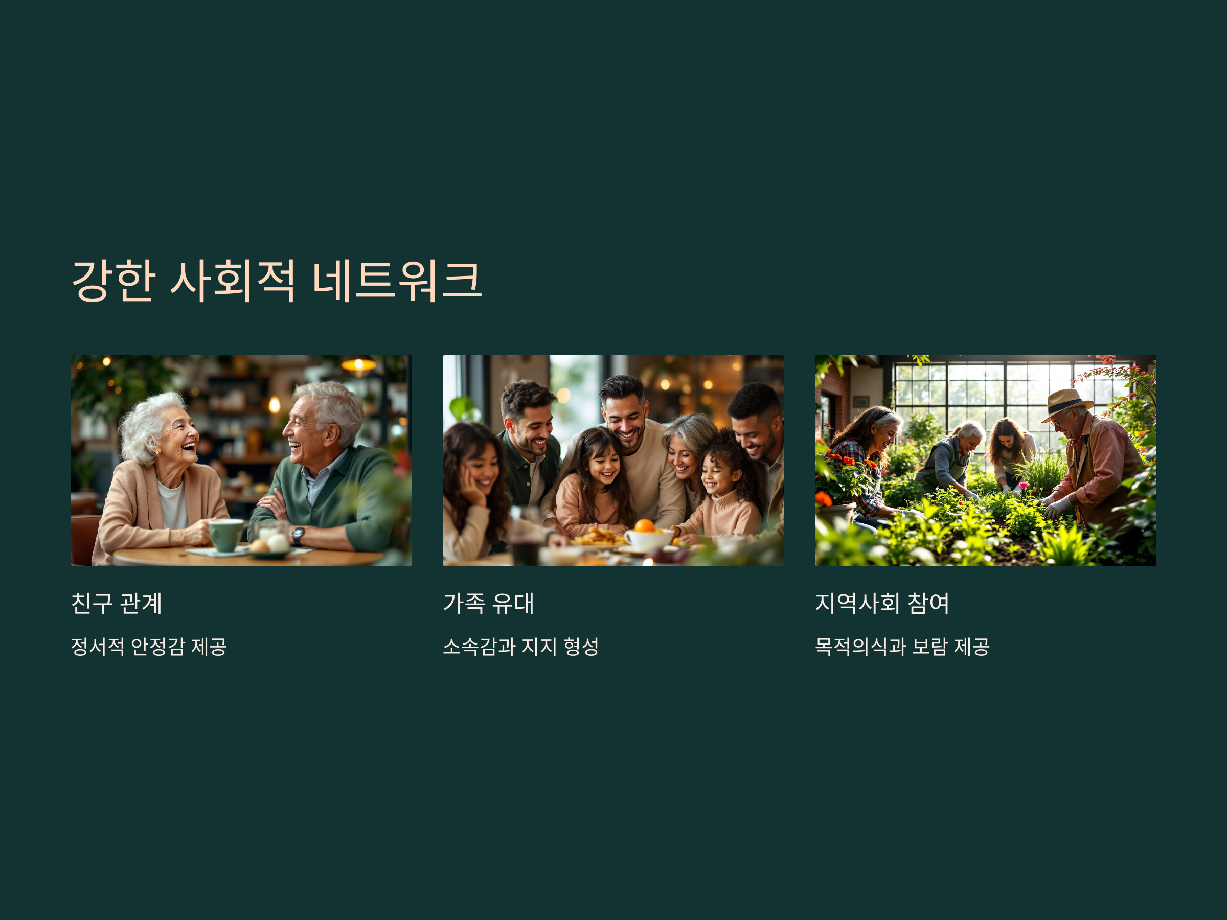 사회적 관계는 노후 건강과 밀접한 관계가 있습니다. 친구나 가족, 그리고 지역 사회와의 활발한 관계 유지는 정신적, 신체적 건강에 중요한 영향을 미칩니다. 사람들과의 상호작용은 정서적인 안정감을 주고, 외로움을 방지하며, 심리적인 충족감을 제공합니다. 또한, 다른 사람들과의 대화나 활동은 뇌 기능을 자극하고 기억력 향상에도 긍정적인 영향을 미칩니다.