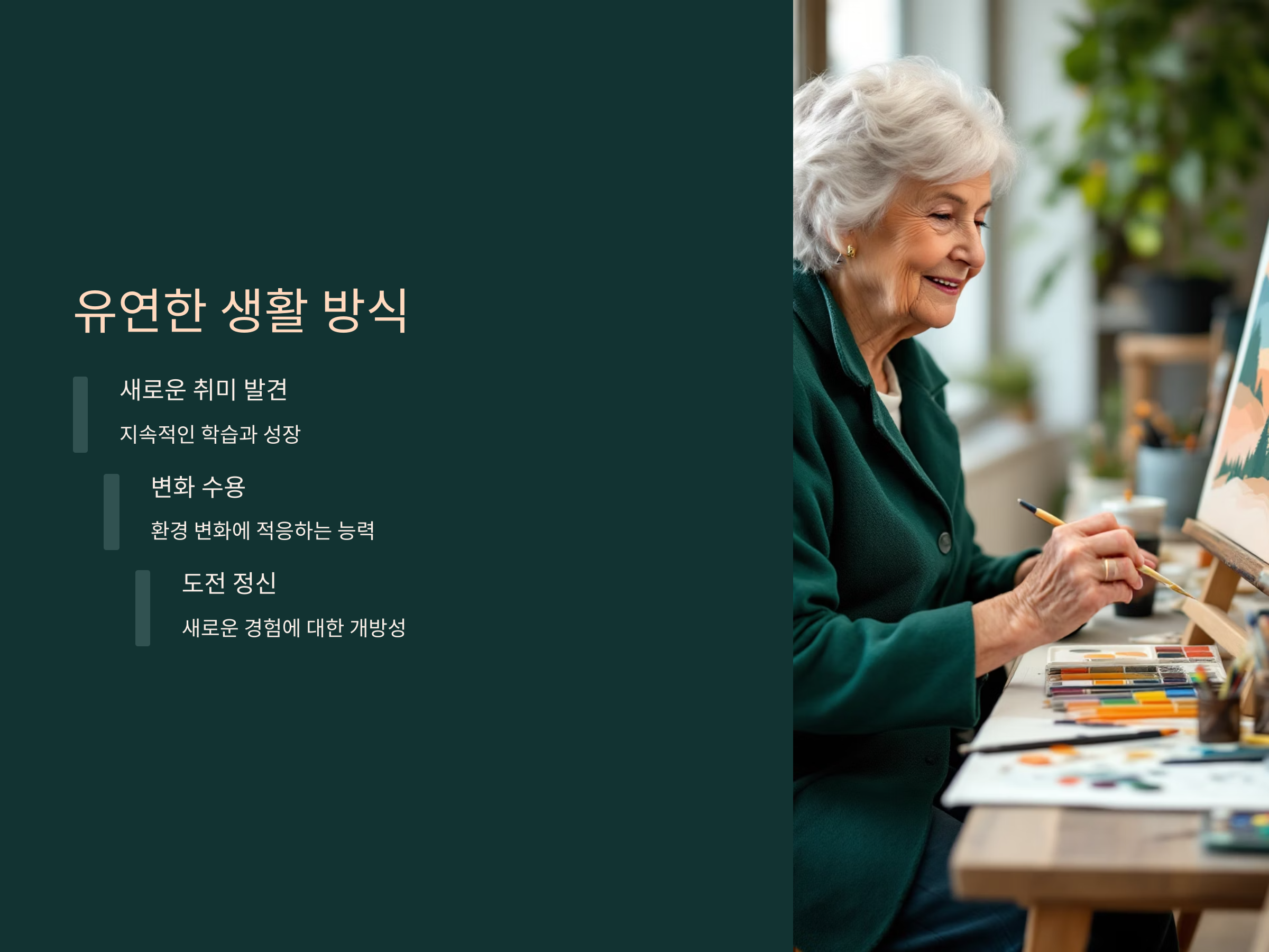 나이가 들수록 생활의 변화에 유연하게 적응하는 능력이 중요해집니다. 변화하는 환경에 맞춰 새로운 취미나 활동을 찾고, 일정에 변화를 주는 것이 좋습니다. 예를 들어, 여행을 가거나 새로운 공부를 시작하는 것처럼 삶의 질을 높일 수 있는 방법을 찾는 것이 유익합니다. 또한, 사람들은 나이가 들수록 자신만의 일상을 고수하려는 경향이 있지만, 때때로 변화와 도전을 수용하는 것이 중요합니다.