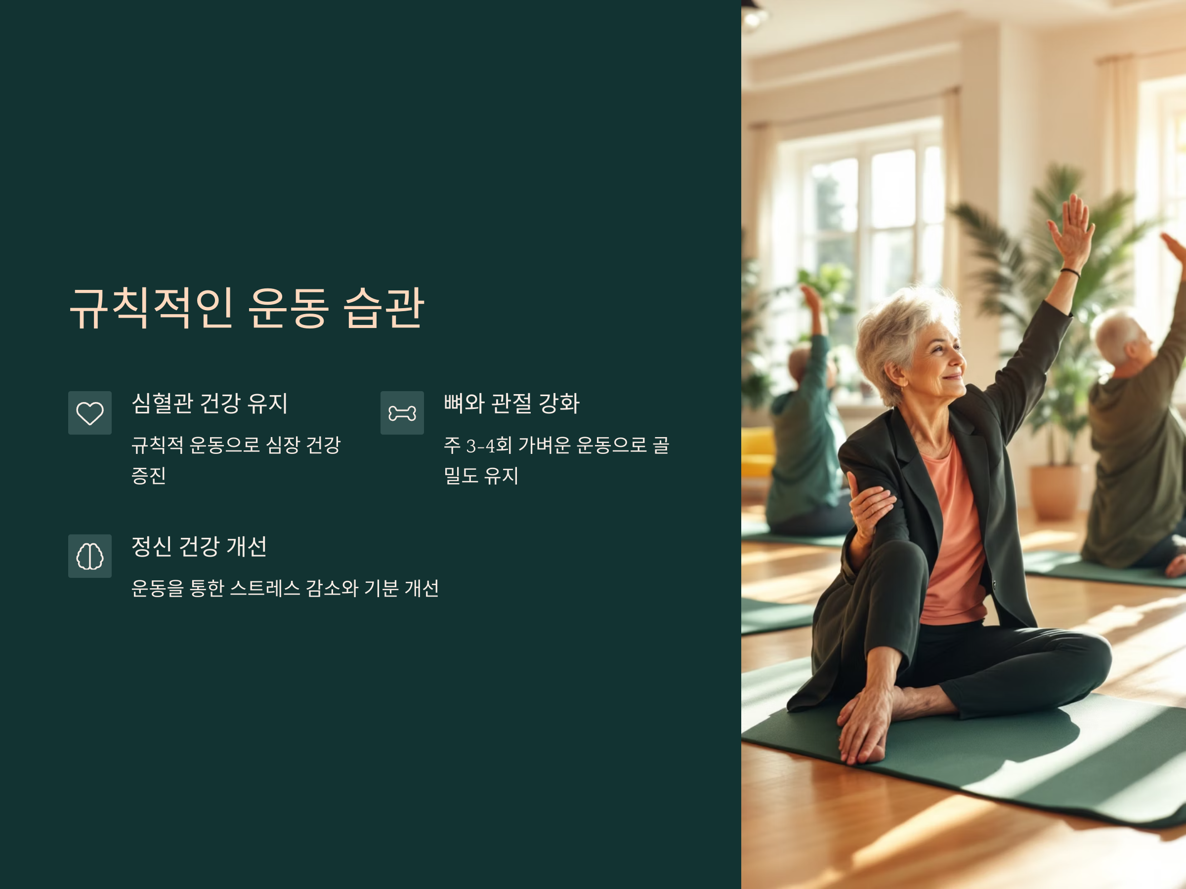 건강한 노후를 위해서는 규칙적인 운동이 필수입니다. 노년층에서 운동은 단지 근육을 강화하는 것에 그치지 않습니다. 꾸준한 운동은 심혈관 건강을 유지하고, 뼈와 관절을 튼튼하게 하며, 정신 건강에도 긍정적인 영향을 미칩니다. 일주일에 3~4회 정도의 가벼운 유산소 운동이나 스트레칭은 건강한 노후를 위한 첫걸음입니다. 특히, 걷기나 자전거 타기, 수영 같은 운동은 부담 없이 할 수 있어 추천됩니다.