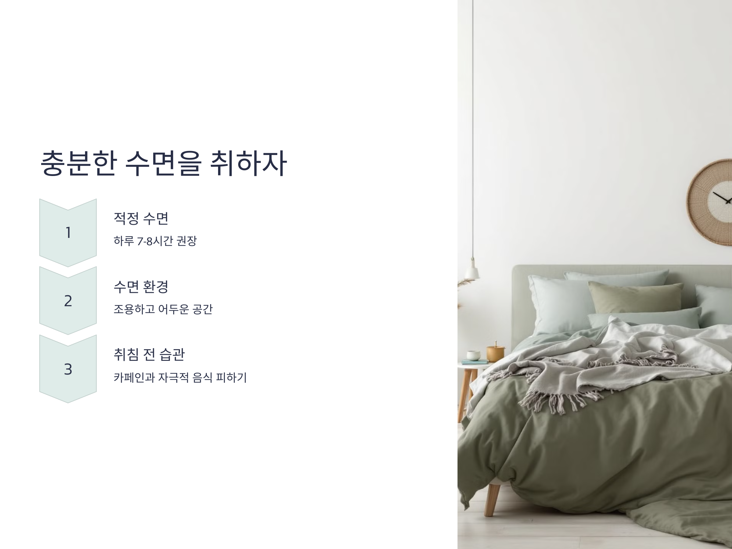 수면 환경을 개선하는 것도 중요합니다. 조용하고 어두운 공간에서 잠을 자는 것이 수면의 질을 높이고, 전자기기 사용을 줄이는 것도 도움이 됩니다. 또한, 잠자기 전에는 카페인과 자극적인 음식을 피하고, 이완할 수 있는 시간을 가지는 것이 좋습니다.