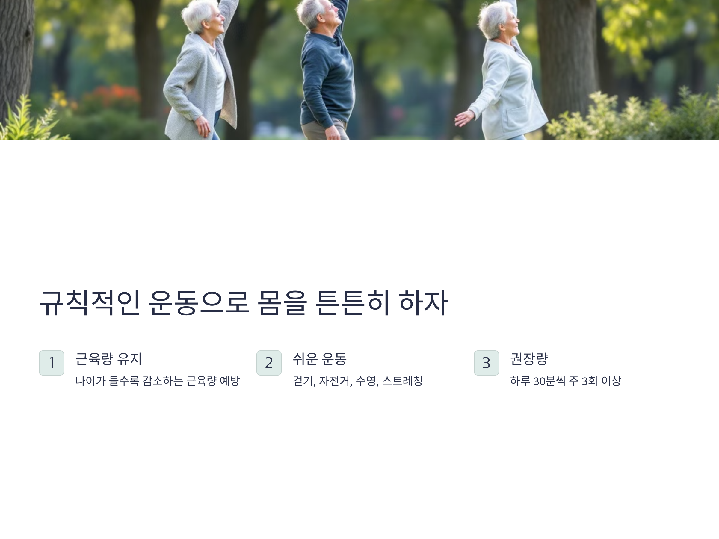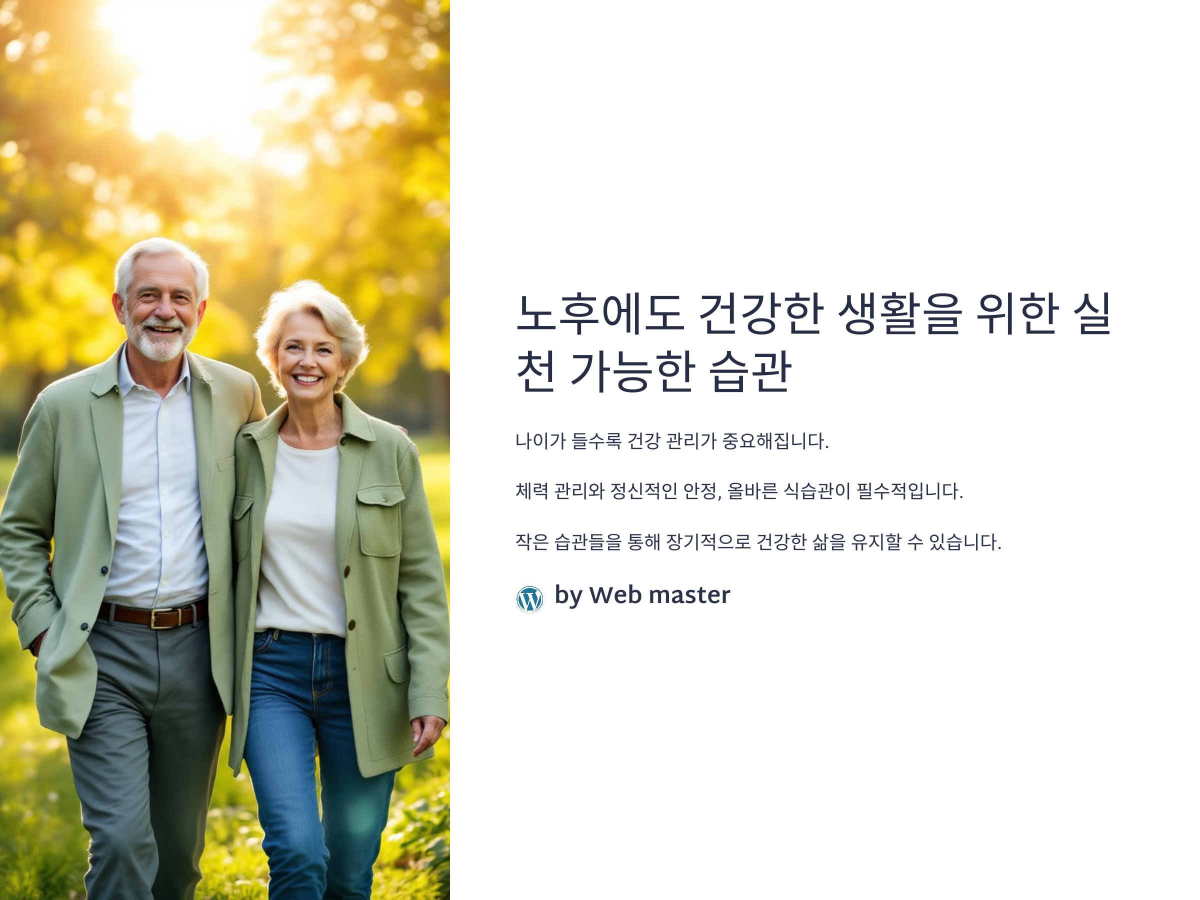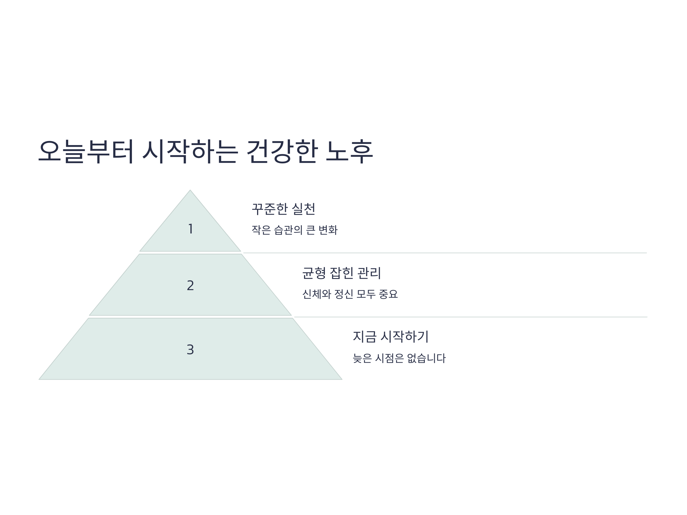 노후에도 건강하고 활기찬 삶을 유지하기 위해서는 꾸준한 노력과 습관이 필요합니다. 건강을 관리하는 데는 너무 늦은 시점이 없습니다. 오늘부터 실천 가능한 습관을 하나씩 시작해보세요!