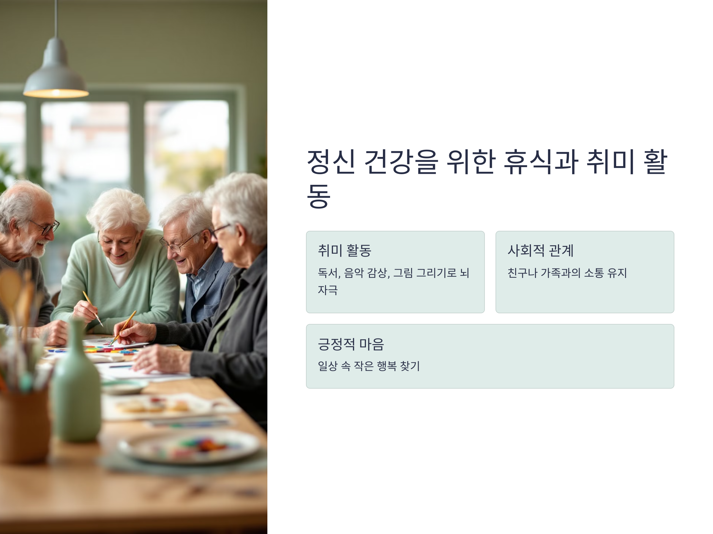 정신 건강도 신체 건강만큼 중요합니다. 노후에는 외로움과 스트레스가 정신적 부담으로 작용할 수 있기 때문에, 이를 해소하기 위한 방법을 찾아야 합니다. 꾸준한 독서나 음악 감상, 그림 그리기 등 취미 활동을 통해 뇌를 자극하고, 정신적인 스트레스를 줄이는 것이 중요합니다.