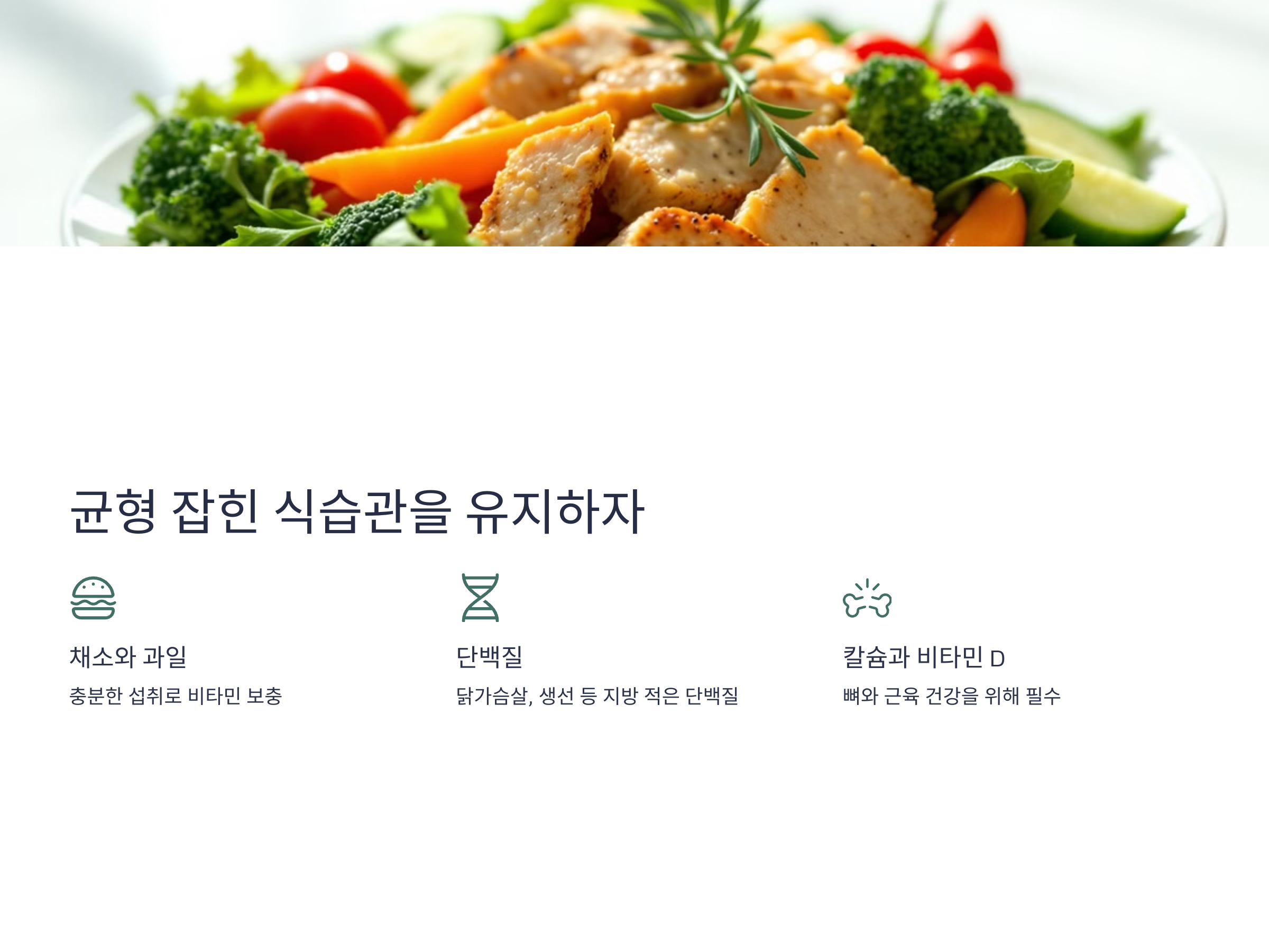 채소와 과일을 충분히 섭취하고, 지방이 적은 단백질(예: 닭가슴살, 생선)을 중심으로 식사를 준비하세요. 또한, 가공식품과 지나치게 짠 음식은 피하고, 신선한 재료를 사용하는 것이 중요합니다. 특히 나이가 들수록 뼈와 근육 건강을 위한 칼슘과 비타민 D가 필요하므로, 이들을 충분히 섭취하는 것도 중요합니다.