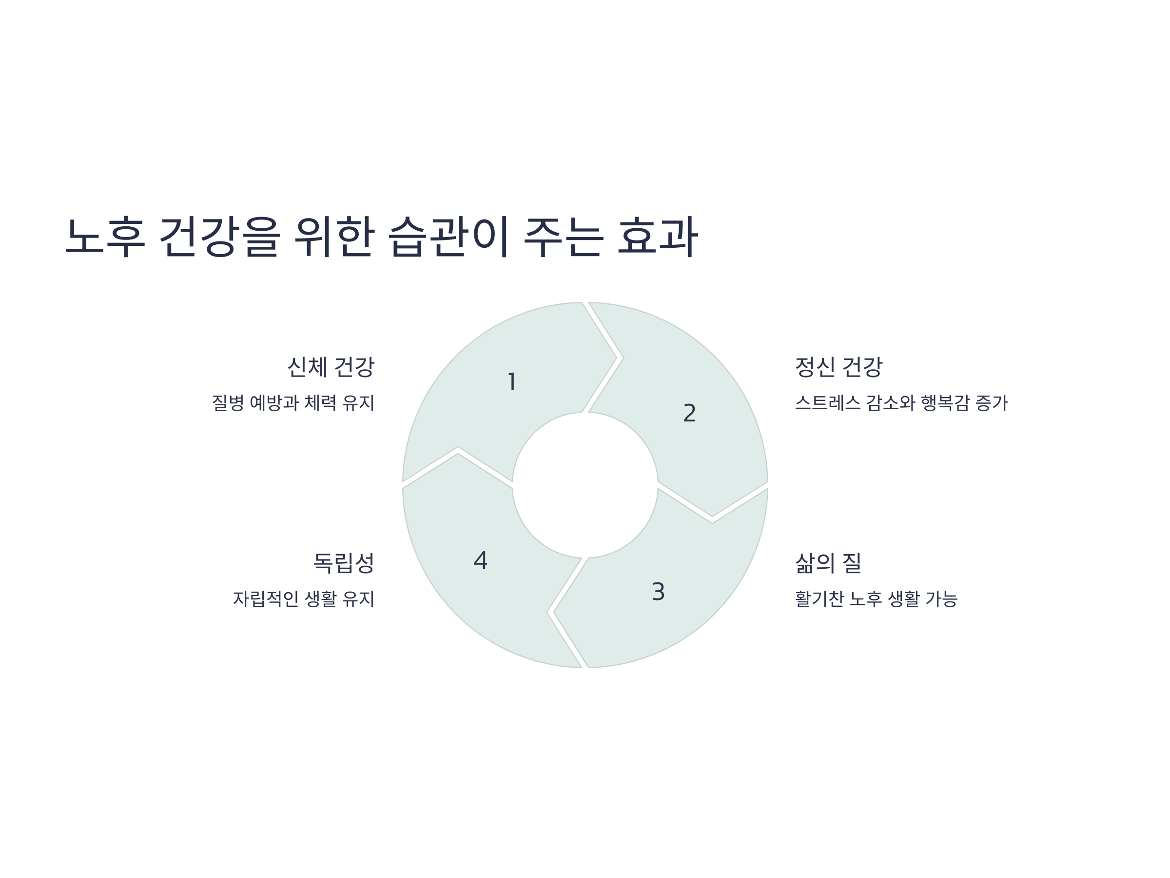 노후에 건강한 생활을 위한 습관을 실천하는 것은 장기적으로 많은 이점을 제공합니다. 규칙적인 운동, 균형 잡힌 식단, 정신 건강 관리, 충분한 수면, 그리고 정기적인 건강 검진은 모두 노후를 건강하고 행복하게 보낼 수 있는 중요한 습관들입니다. 이 습관들은 단기적인 효과보다는 시간이 지나면서 큰 변화를 가져옵니다. 따라서 노후를 준비하는 데 있어 지금부터라도 실천할 수 있는 작은 변화들을 시작하는 것이 중요합니다.