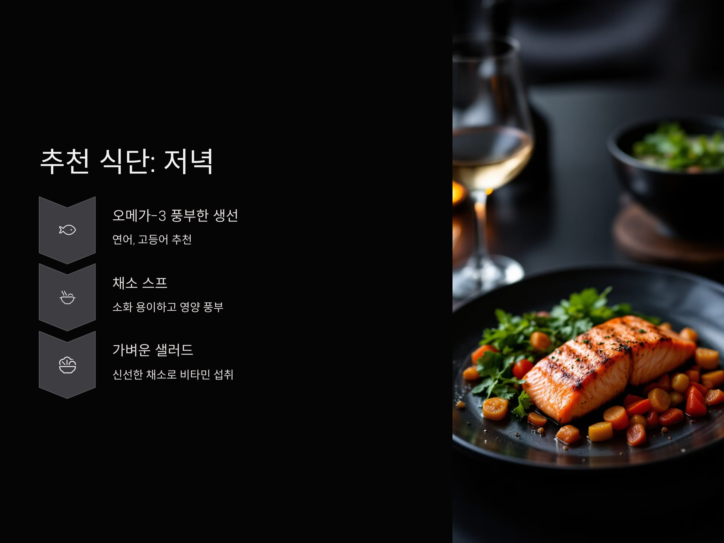 저녁 식사는 가벼우면서도 영양이 풍부해야 합니다. 소화가 용이한 단백질 중심의 식사를 선택하는 것이 좋습니다. 예를 들어, 연어나 고등어와 같은 오메가-3가 풍부한 생선을 구워서 채소와 함께 섭취하는 것이 좋습니다. 또한, 야채를 듬뿍 넣은 스프나 샐러드를 포함시키면 더욱 건강한 저녁을 만들 수 있습니다. 저녁에는 지나치게 기름지거나 고칼로리 음식을 피하고, 과식하지 않도록 주의해야 합니다.