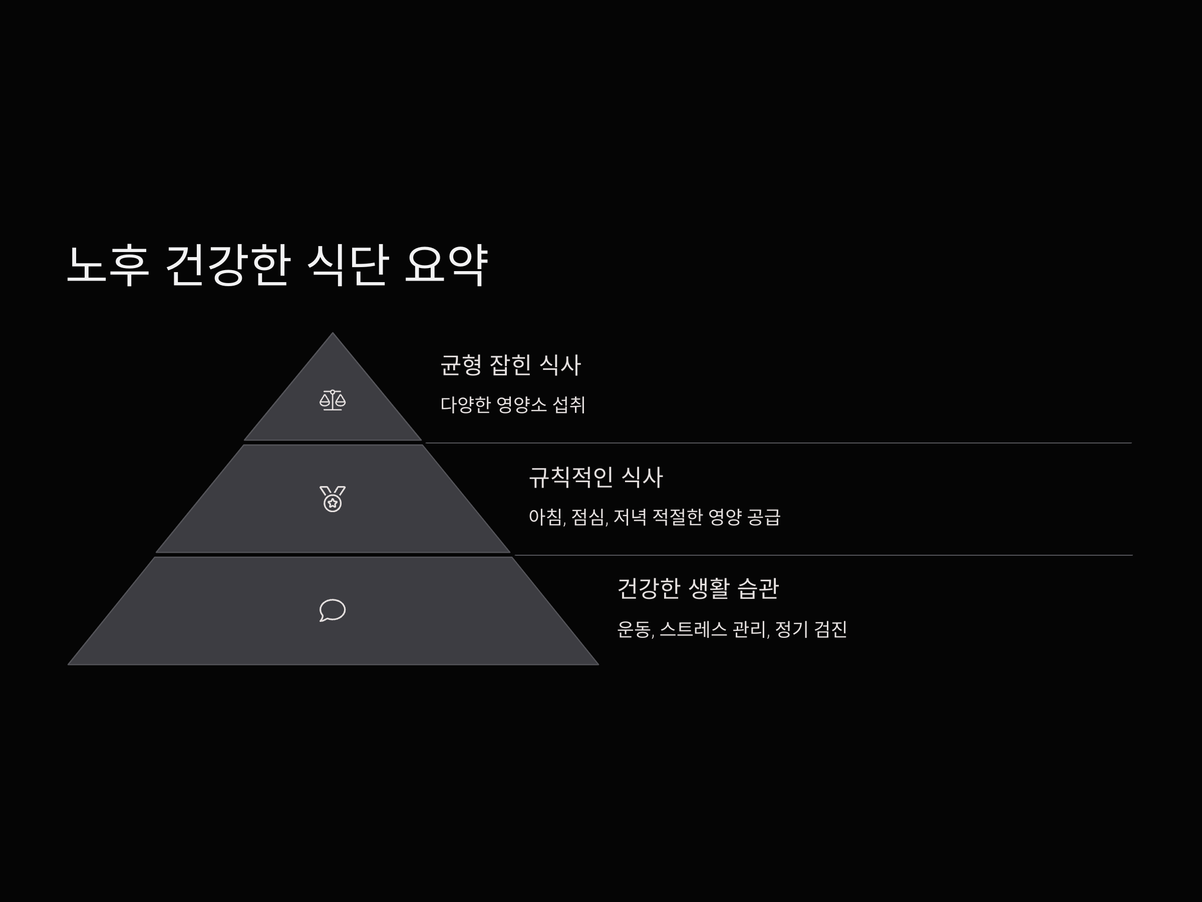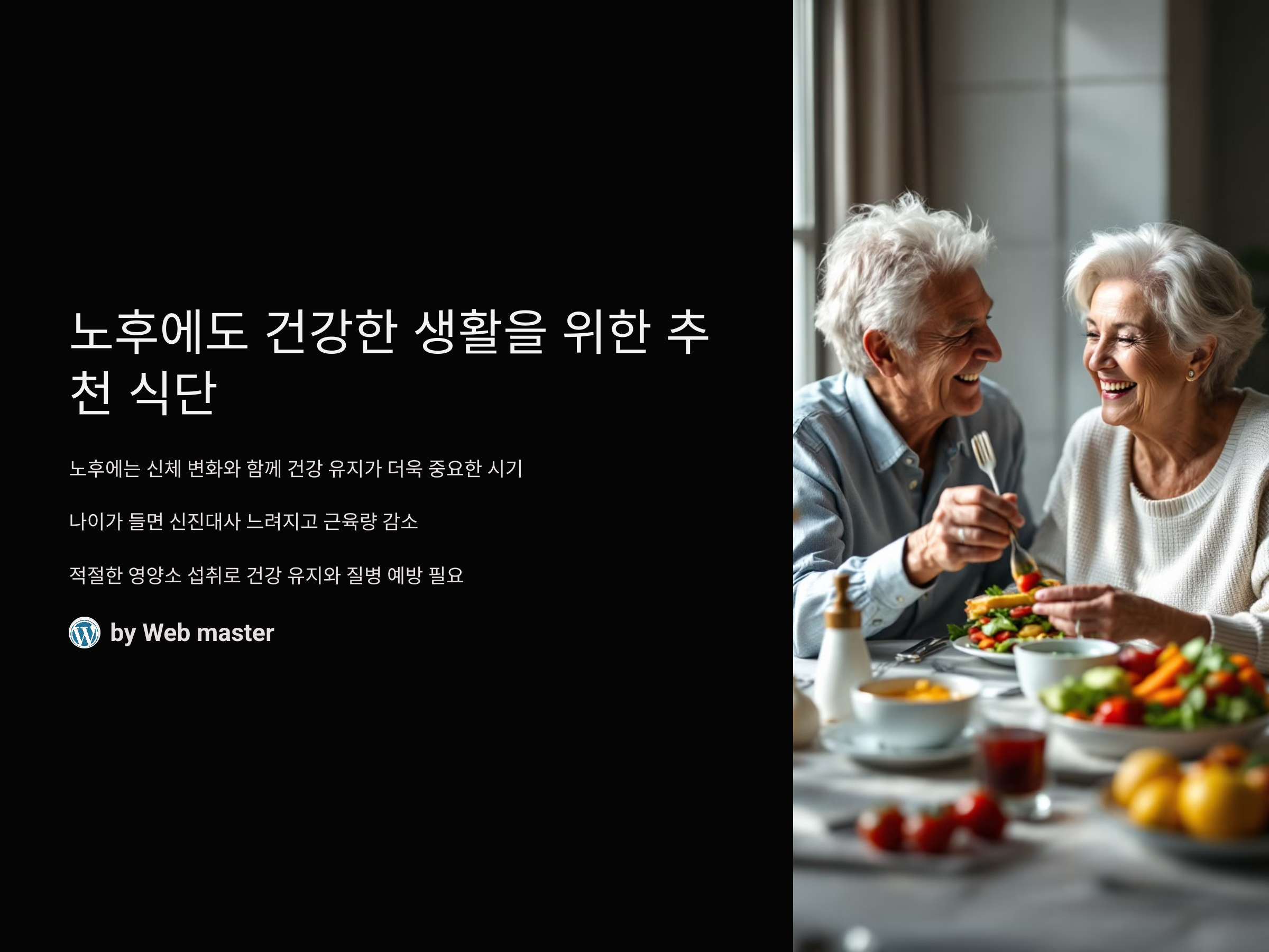 노후에는 신체 변화와 함께 건강 유지가 더욱 중요한 시기입니다. 나이가 들어감에 따라 신진대사가 느려지고, 근육량이 감소하며, 여러 만성질환의 위험도 커집니다. 그렇기 때문에 건강을 유지하고 질병을 예방하는 데 필요한 영양소를 적절하게 섭취하는 것이 중요합니다. 특히, 노년기에는 뼈, 근육, 면역력, 그리고 소화기 건강에 집중해야 합니다. 여기서는 노후에도 건강을 유지할 수 있는 추천 식단을 소개하겠습니다.