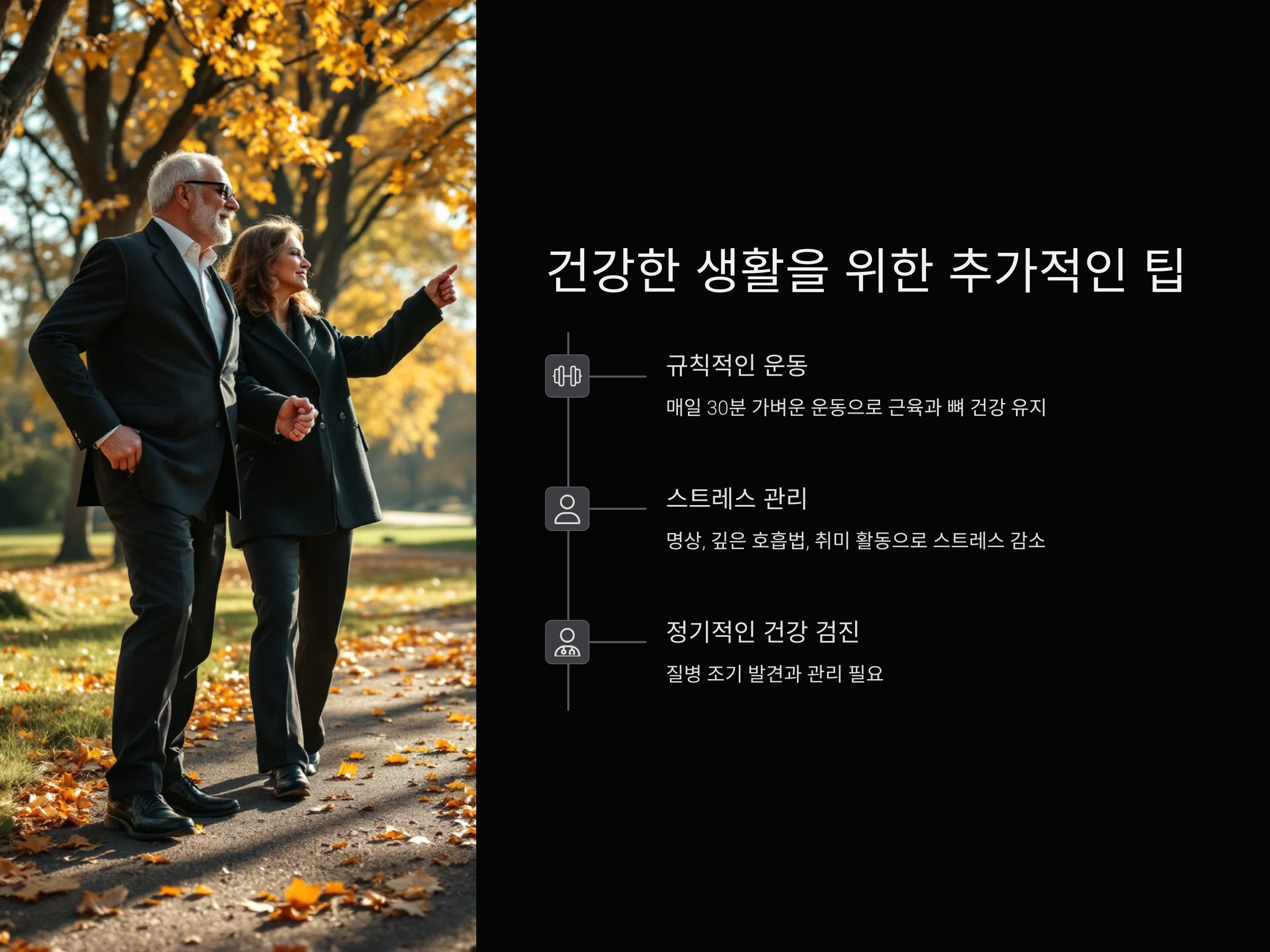 건강한 식습관 외에도 노후에 건강을 유지하기 위한 몇 가지 추가적인 팁이 있습니다. 첫째, 규칙적인 운동은 매우 중요합니다. 매일 30분 정도의 가벼운 운동을 통해 근육을 유지하고, 뼈 건강을 강화할 수 있습니다. 둘째, 스트레스 관리는 노후 건강에 중요한 요소입니다. 명상, 깊은 호흡법, 취미 활동 등을 통해 스트레스를 줄이는 것이 중요합니다. 마지막으로, 정기적인 건강 검진을 통해 질병을 조기에 발견하고 관리하는 것이 필요합니다.