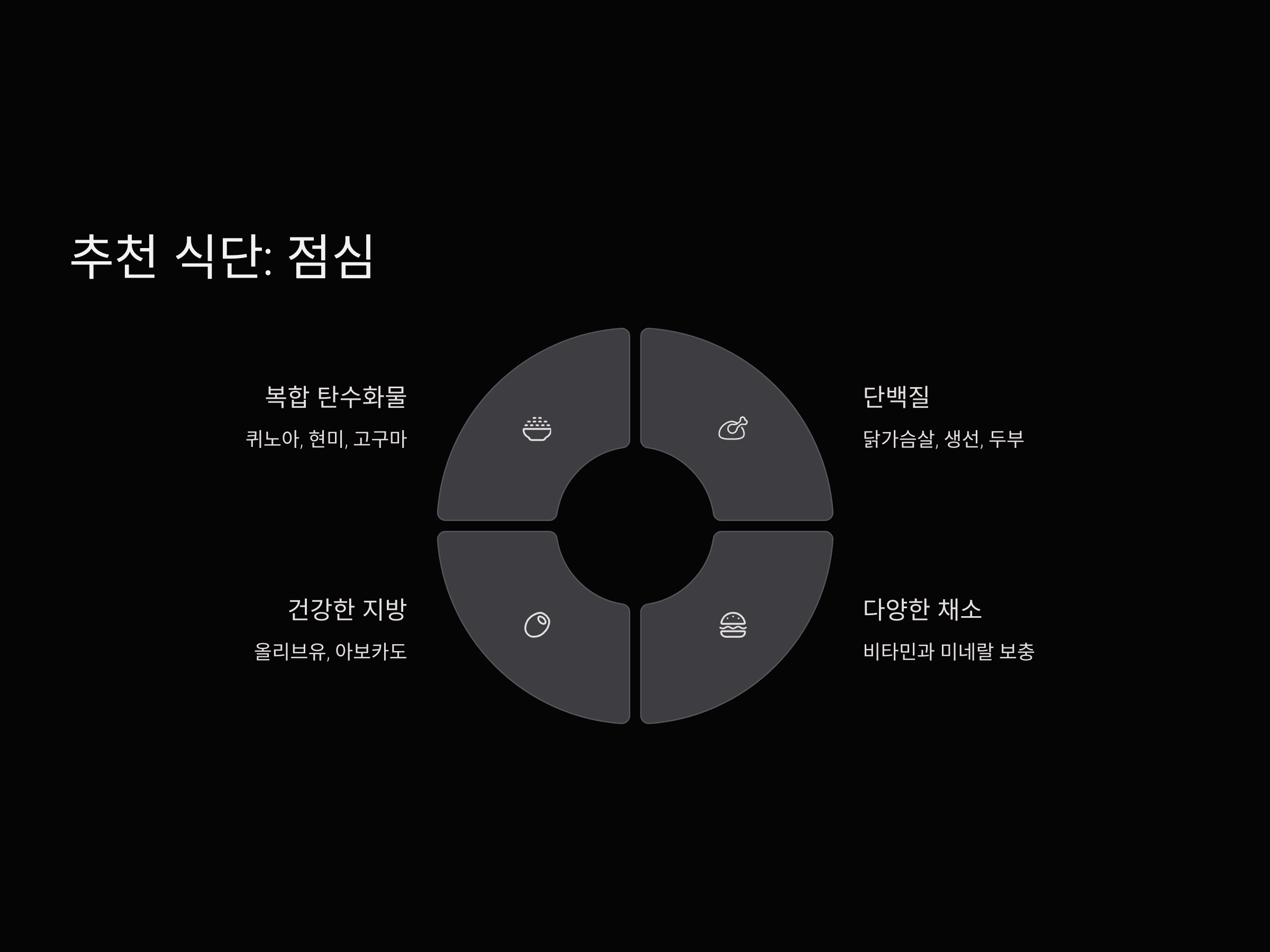 점심은 하루 중 에너지가 가장 필요한 시간입니다. 이때는 복합 탄수화물, 단백질, 그리고 신선한 채소를 포함하는 균형 잡힌 식사가 필요합니다. 퀴노아, 현미, 고구마 등과 같은 복합 탄수화물을 기본으로, 닭가슴살, 생선, 두부 등의 고단백 식품을 추가합니다. 또한, 다양한 색상의 채소를 함께 섭취하여 비타민과 미네랄을 보충하세요. 건강한 지방을 포함하려면 올리브유나 아보카도를 추가하는 것도 좋습니다.