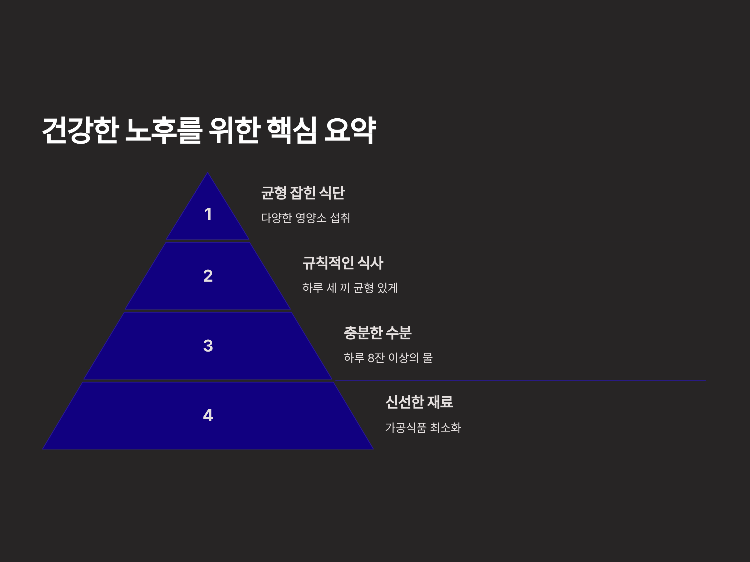 이러한 영양소를 균형 있게 섭취하면 노년기의 건강 유지에 큰 도움이 됩니다.