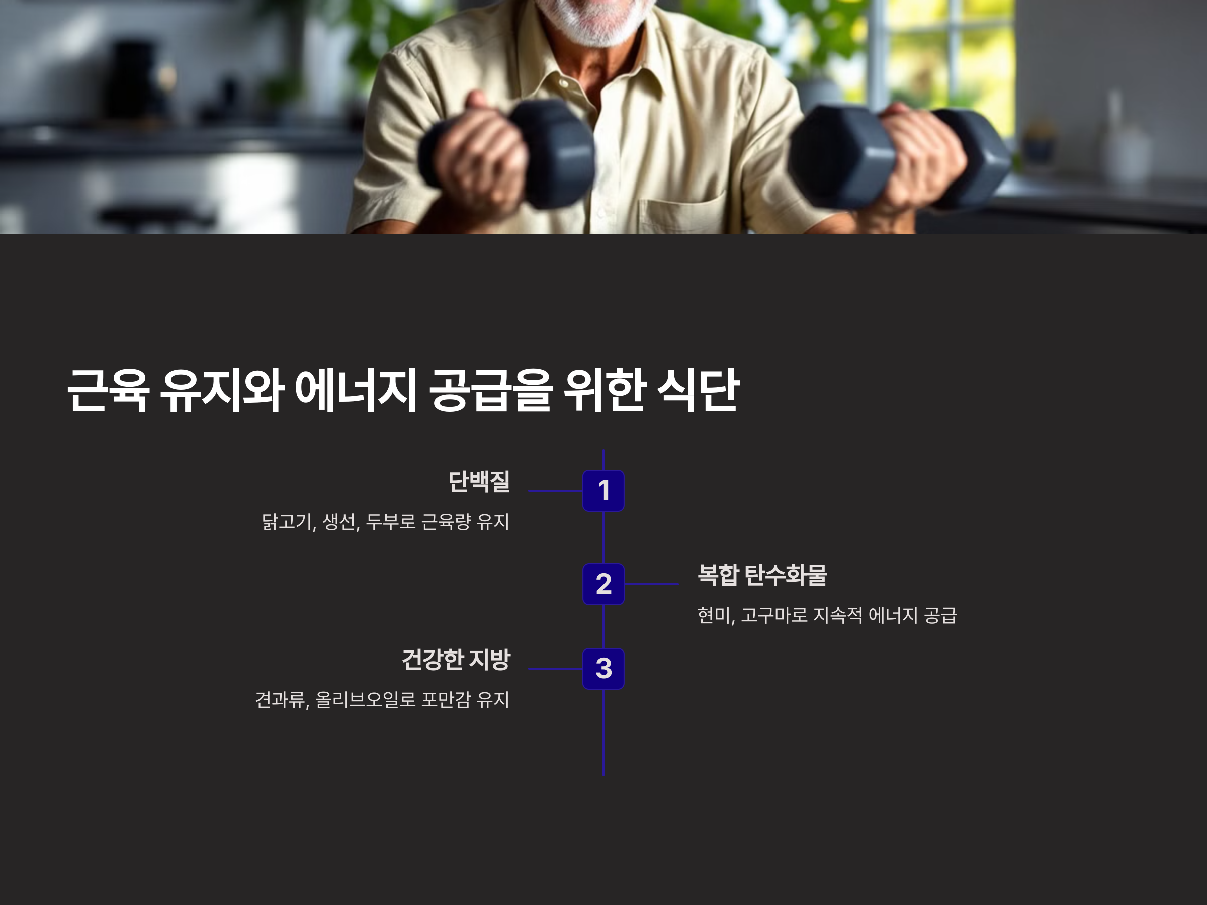 노년기에는 근육량 감소를 막고 활력을 유지하기 위한 식단이 필요합니다. 단백질과 함께 에너지를 공급하는 건강한 탄수화물과 지방을 함께 섭취하는 것이 중요합니다.