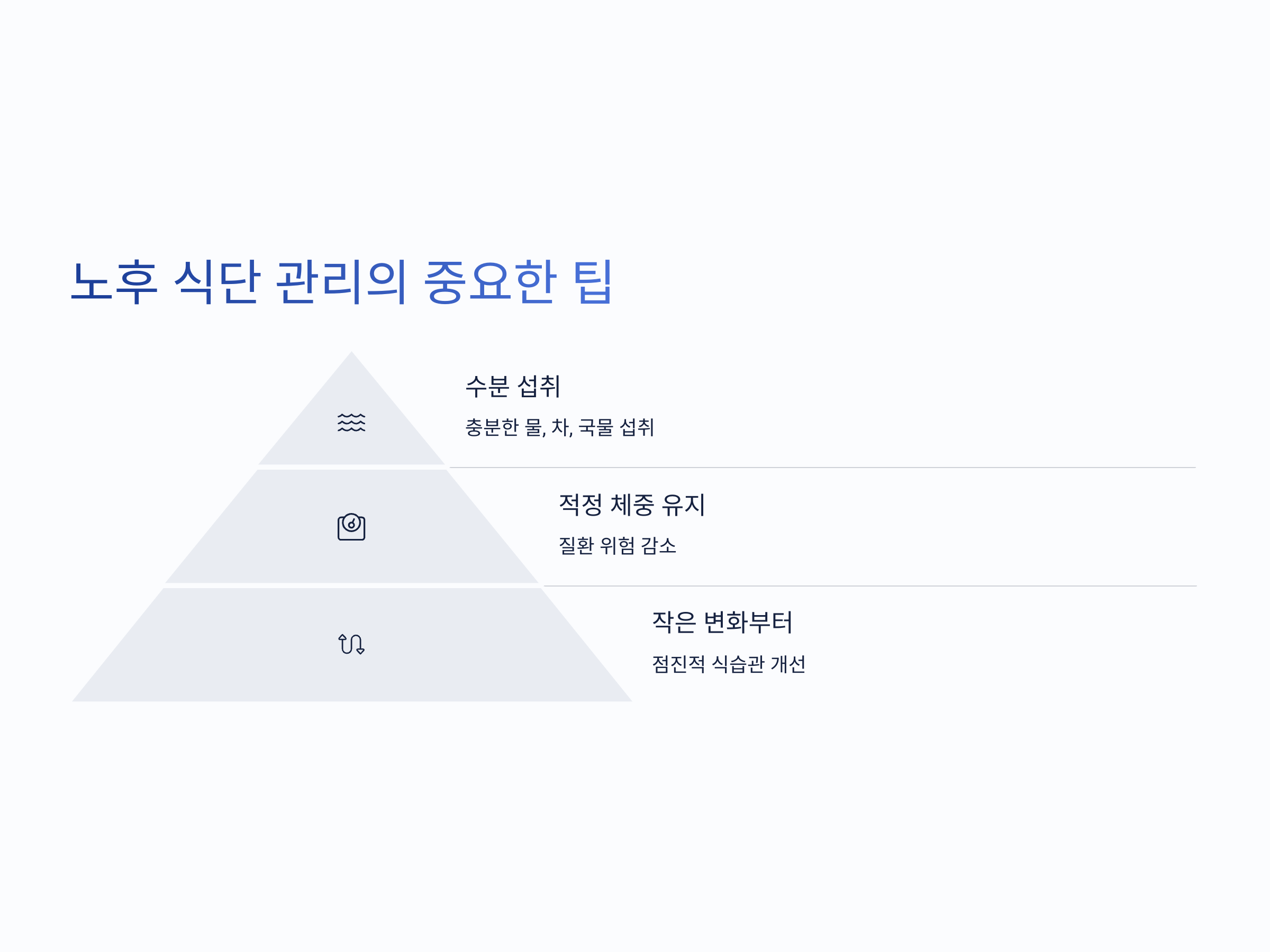 - 수분 섭취: 나이가 들면 체내 수분 함량이 줄어들기 때문에, 충분한 수분을 섭취하는 것이 중요합니다. 물, 차, 국물 등을 충분히 섭취하여 탈수를 예방해야 합니다.