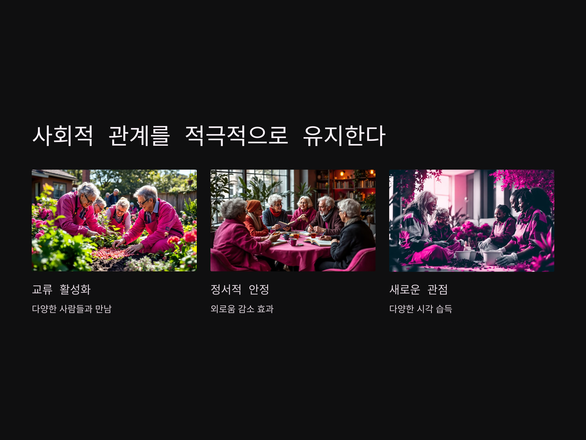 사회적 관계를 유지하는 것은 외로움을 줄이고, 정신적인 건강을 증진시키는 데 큰 도움이 됩니다. 또한, 다양한 사람들과의 대화를 통해 새로운 관점을 얻고, 더 많은 배움을 얻을 수 있는 기회를 제공합니다. 따라서 노후에 지속적으로 배우는 사람들은 항상 다른 사람들과의 교류를 중요한 삶의 일부로 여깁니다.