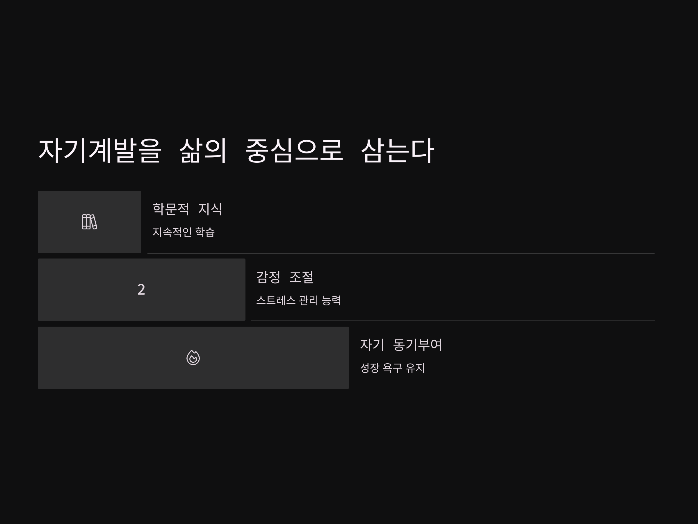 노후에도 배우는 사람들은 자기계발을 삶의 중심으로 삼습니다. 그들은 학문적 지식뿐만 아니라 자기 자신을 성장시키는 데 많은 시간을 투자합니다. 예를 들어, 감정 조절, 스트레스 관리, 자기 동기 부여 등 삶의 질을 높이는 방법에 대해 배우고 실천하려는 노력을 기울입니다.