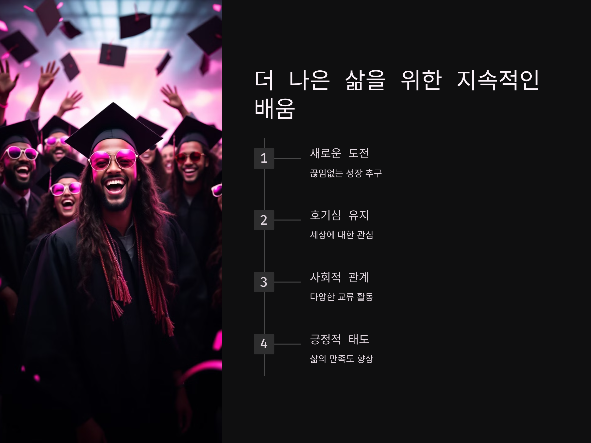 새로운 것을 배우는 것은 단순히 지식 습득을 넘어서, 뇌의 활동을 촉진하고 기억력을 향상시키는 데도 도움을 줍니다. 또한, 새로운 도전은 성취감을 주어 삶의 의미를 더하고, 자아 존중감을 높이는 데도 기여합니다. 은퇴 후에도 계속 배우는 사람들은 이런 점에서 신체적, 정신적으로 건강을 유지할 수 있는 비결을 가지고 있습니다.
