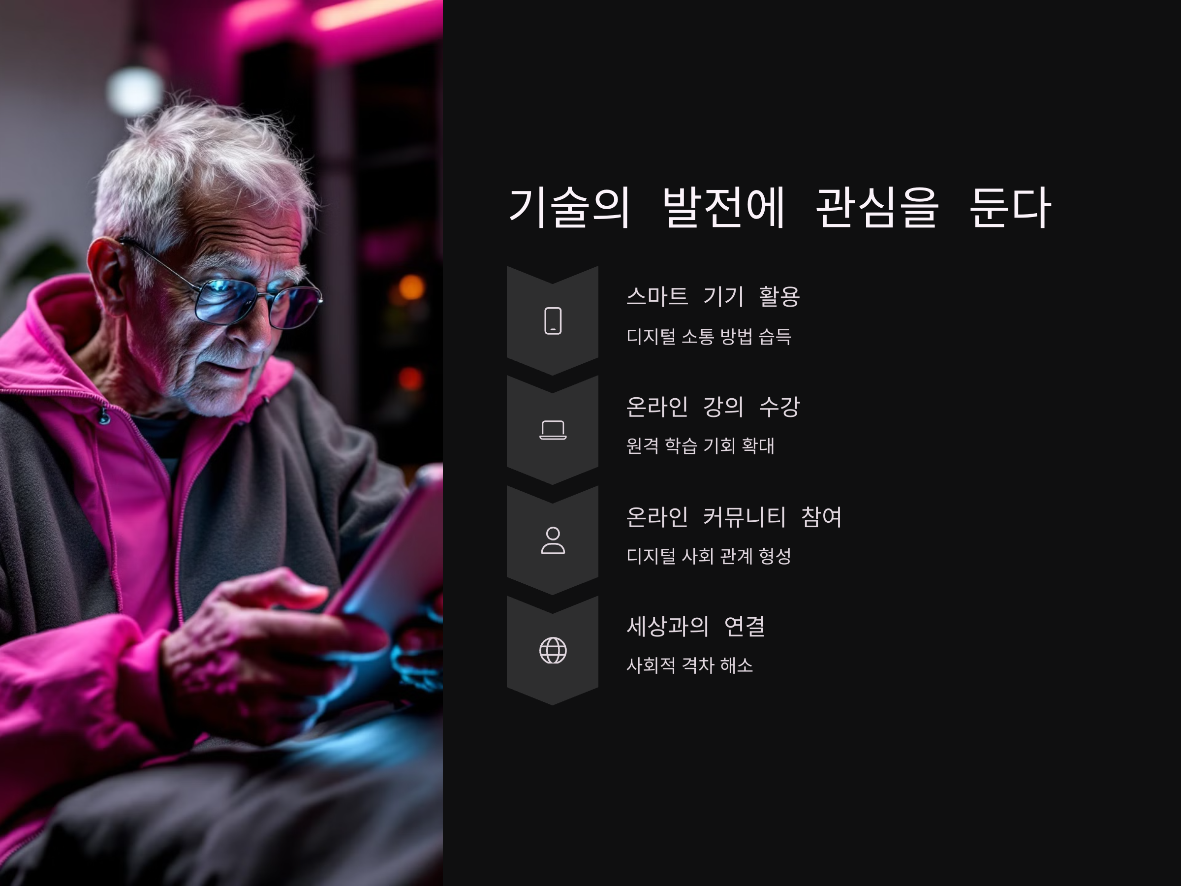기술을 배우는 것은 단순히 편리함을 넘어, 세상과 소통하고 최신 트렌드에 대한 이해를 돕습니다. 이를 통해 세상에 대한 관심을 유지하고, 사회적 격차를 좁히는 데 중요한 역할을 합니다.