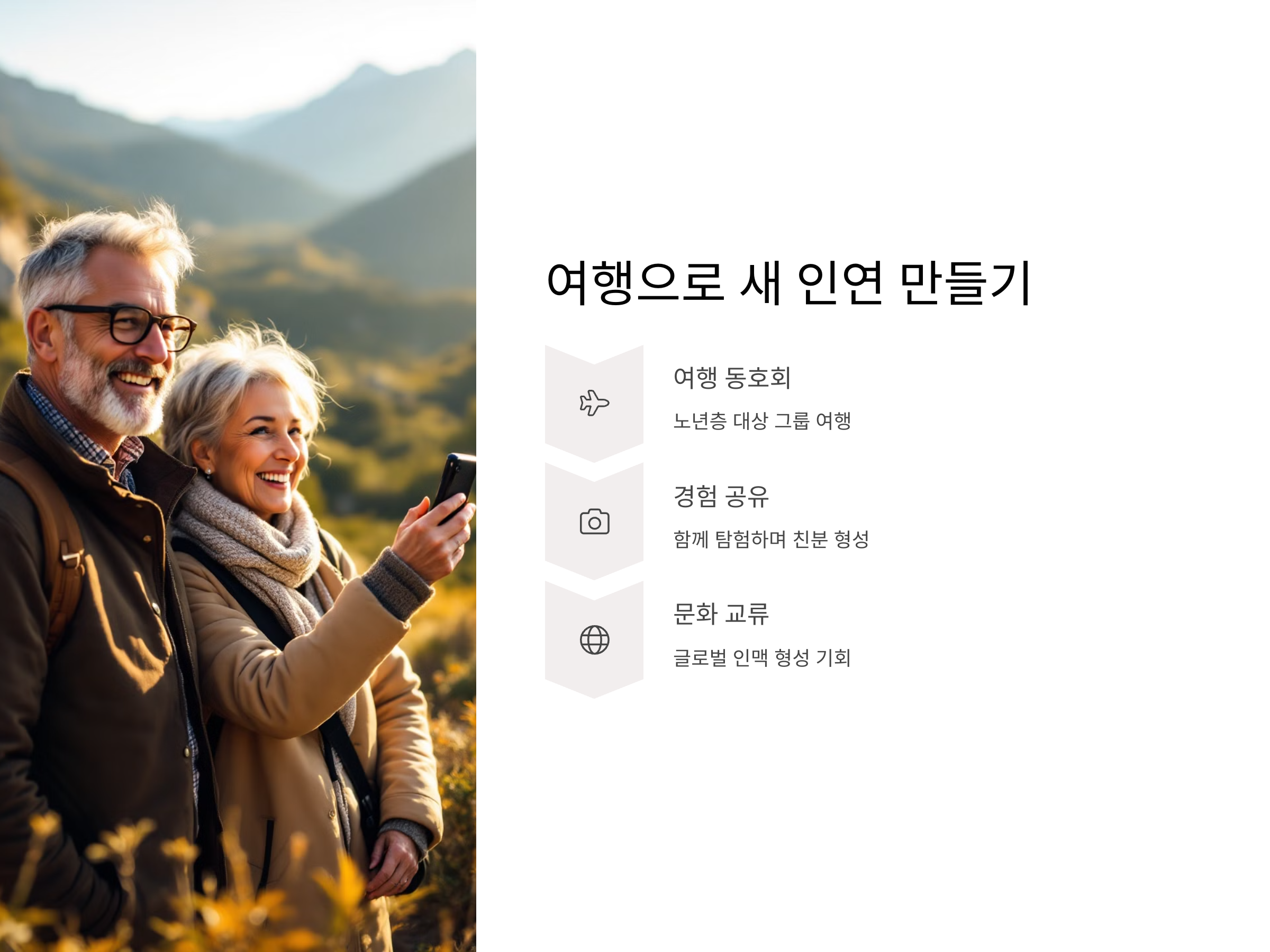 여행은 새로운 사람들과 만나는 훌륭한 기회를 제공합니다. 여행 동호회에 가입하거나, 여행 프로그램에 참여하여 새로운 사람들을 만날 수 있습니다. 많은 여행사에서는 노년층을 대상으로 한 그룹 여행 프로그램을 제공하며, 이 프로그램은 같은 목적지를 향해 가는 사람들과의 친밀한 관계를 형성할 수 있는 기회를 제공합니다. 여행 중에 경험을 나누고, 함께 새로운 장소를 탐험하면서 자연스럽게 친분을 쌓을 수 있습니다.