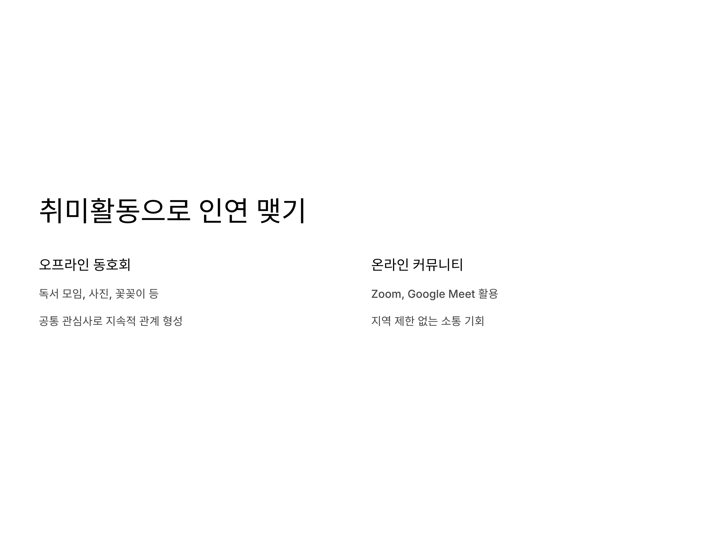 이와 함께 온라인 취미 커뮤니티도 활용할 수 있습니다. 최근에는 다양한 연령층을 위한 온라인 커뮤니티가 활성화되고 있습니다. 특히 Zoom이나 Google Meet과 같은 온라인 플랫폼을 통해 집에서 편안하게 참여할 수 있는 취미 활동도 많습니다. 이런 온라인 활동은 지역에 관계없이 더 많은 사람들과 소통할 수 있는 기회를 만들어줍니다.