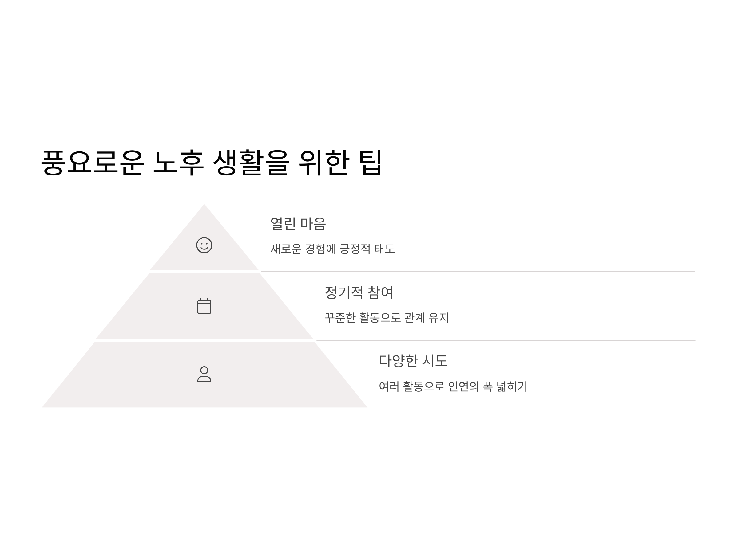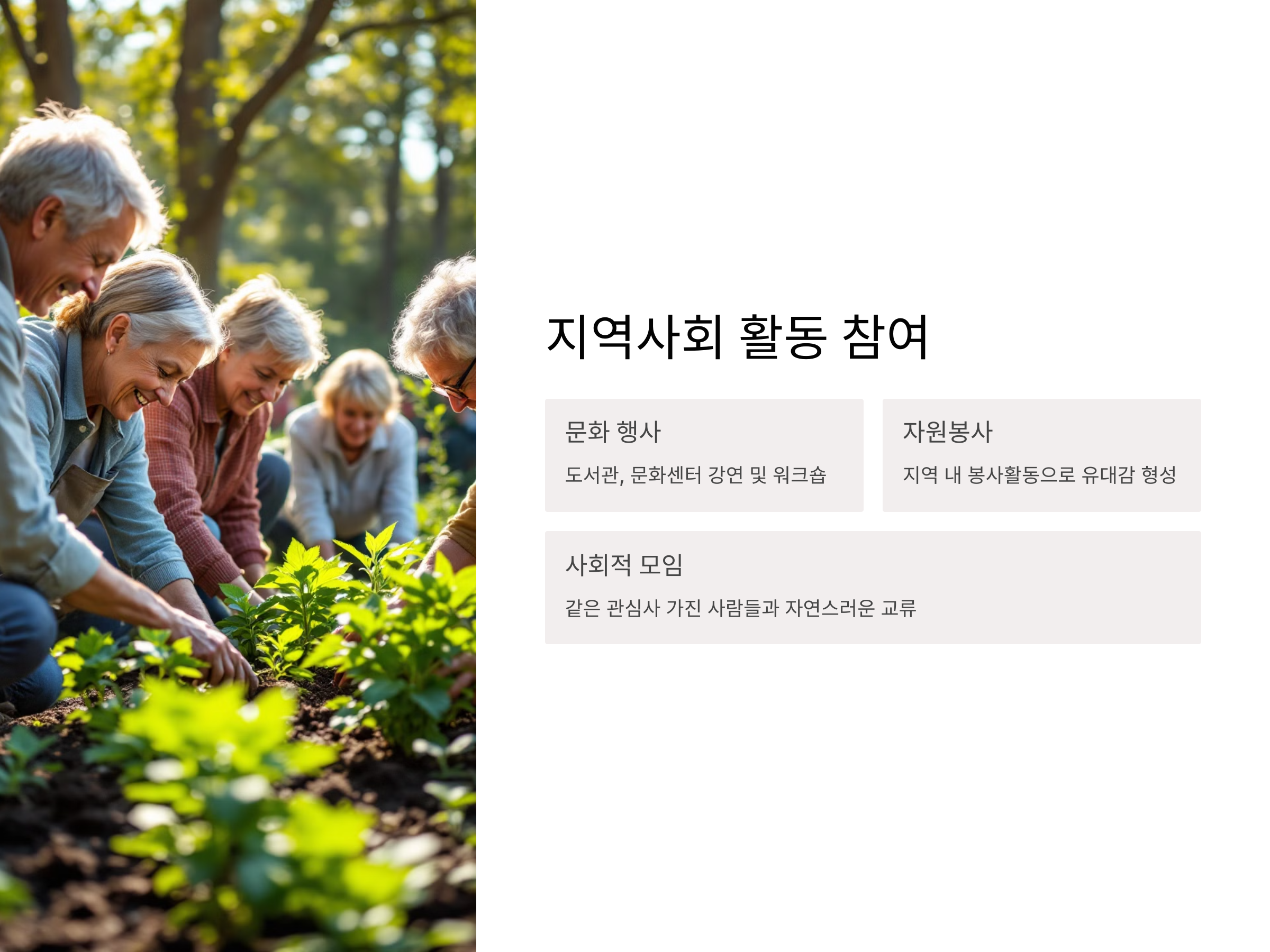노후에도 새로운 사람을 만나는 것은 결코 어렵지 않습니다. 오히려 다양한 기회를 활용하고, 열린 마음으로 사람들과의 관계를 맺어 나가면, 삶의 질이 크게 향상됩니다. 커뮤니티 활동, 취미 모임, 여행, 봉사 활동 등 여러 방면에서 적극적으로 참여하며 사람들과의 유대를 강화할 수 있습니다. 이러한 경험은 더욱 풍요롭고 의미 있는 노후를 만들어 줄 것입니다. 나이가 들수록 더 많은 기회가 존재한다는 사실을 기억하고, 항상 열린 마음으로 사람들과 소통하며 즐거운 인생을 살아가시길 바랍니다.