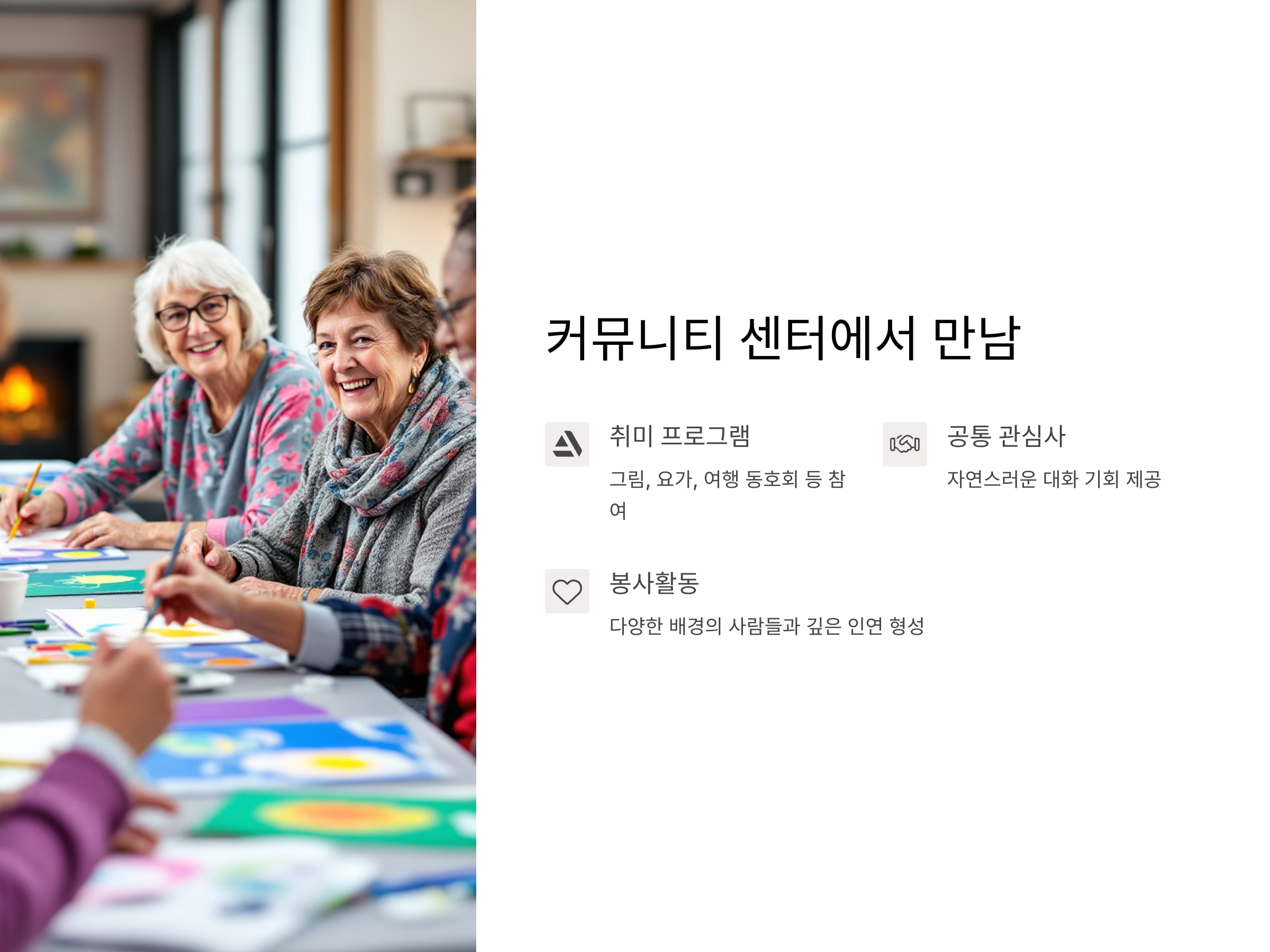 노후에 새로운 사람을 만날 수 있는 또 다른 방법은 취미활동입니다. 당신의 관심사와 취미에 맞는 동호회에 가입하면, 그 분야에서 활동하는 다른 사람들과 자연스럽게 교류할 수 있습니다. 예를 들어, 독서 모임, 사진 동호회, 꽃꽂이 클래스 등 다양한 분야의 동호회가 존재합니다. 취미를 함께 나누는 사람들과의 만남은 서로에게 긍정적인 영향을 미치고, 지속적으로 관계를 이어갈 수 있는 좋은 기회를 제공합니다.