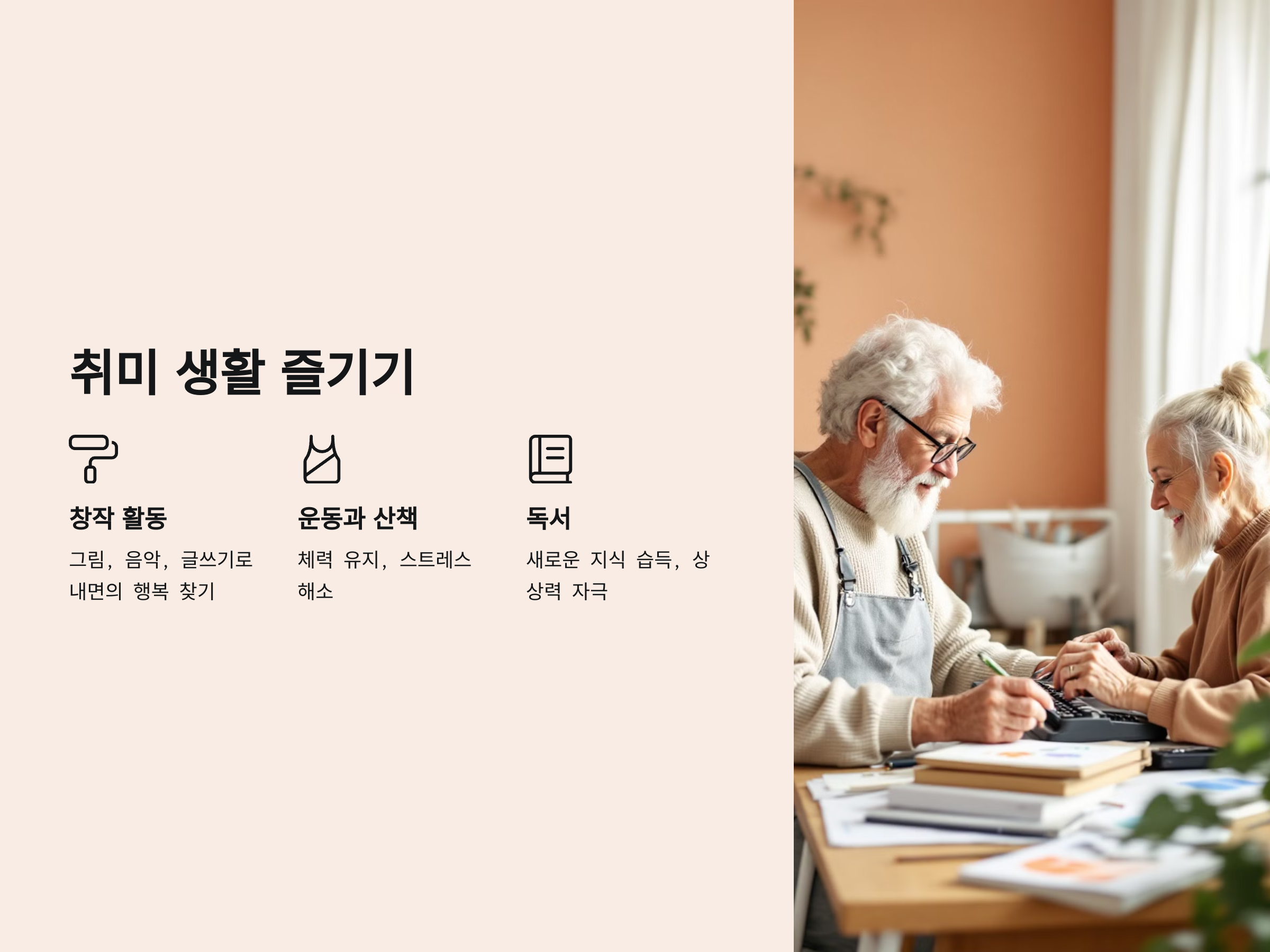 나이가 들어서도 새로운 취미를 찾고, 이를 꾸준히 즐기는 것은 매우 중요합니다. 취미는 단순한 여가 활동 이상의 의미를 가질 수 있습니다. 자신의 관심사를 찾고, 그에 몰두함으로써 외로움을 느낄 틈이 없습니다.