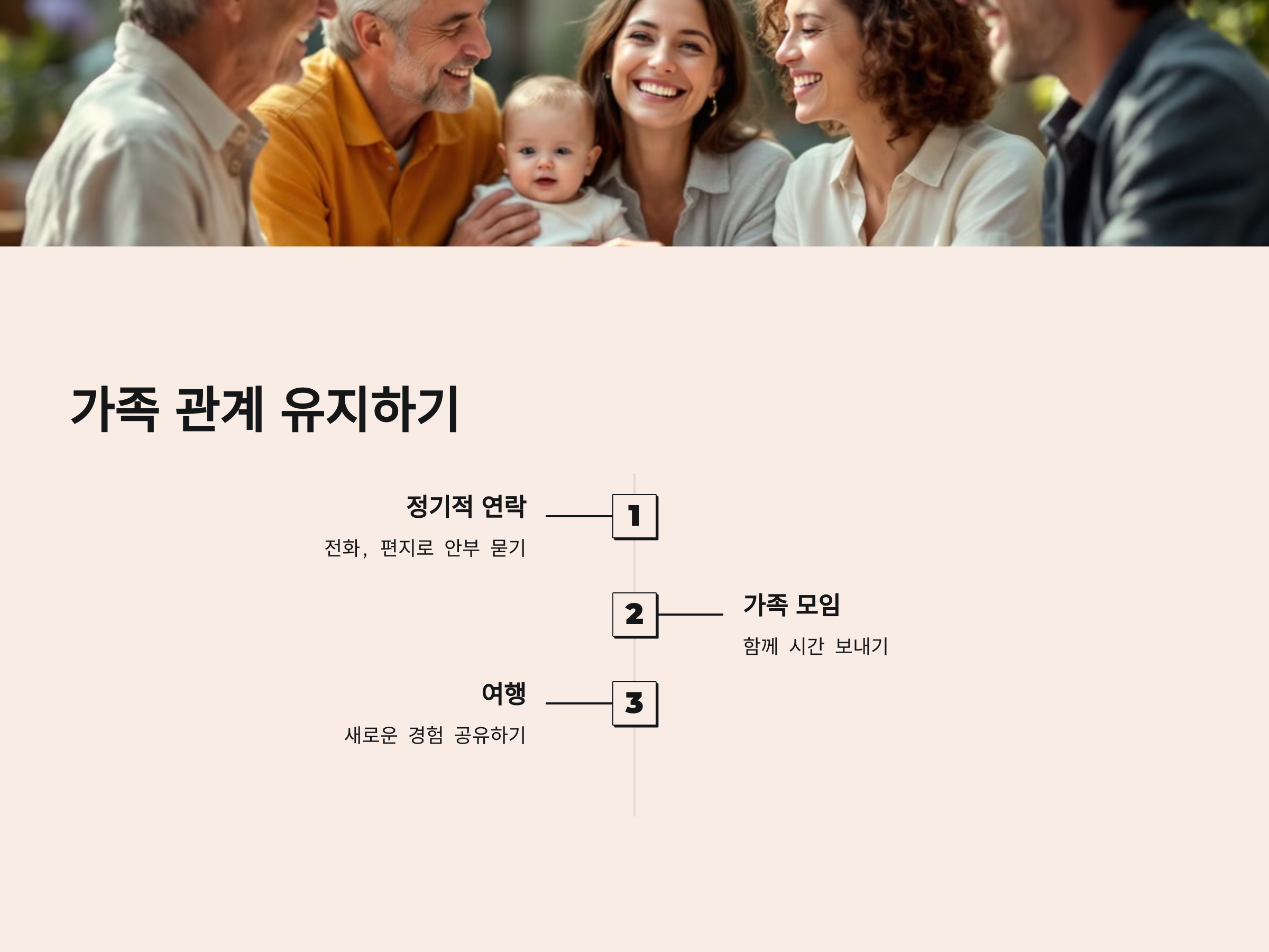 가족과의 관계를 유지하기 위해서는 정기적인 연락을 취하고, 함께 시간을 보내려고 노력하는 것이 중요합니다. 작은 가족 모임이나 여행, 외식 등을 통해 끊임없이 가족과의 관계를 강화하는 것이 중요합니다.